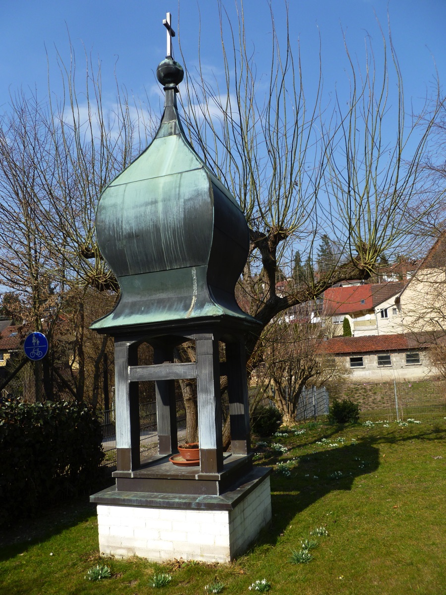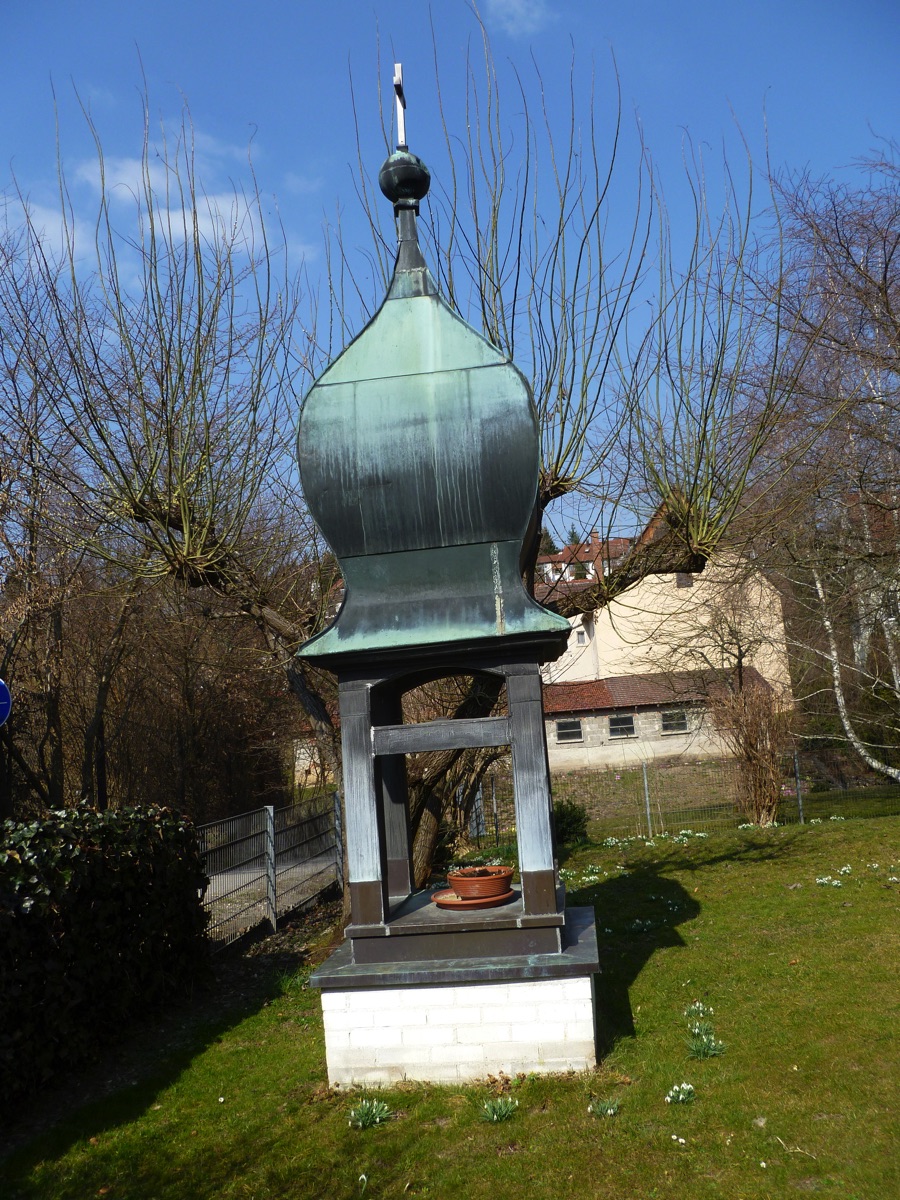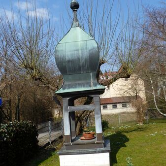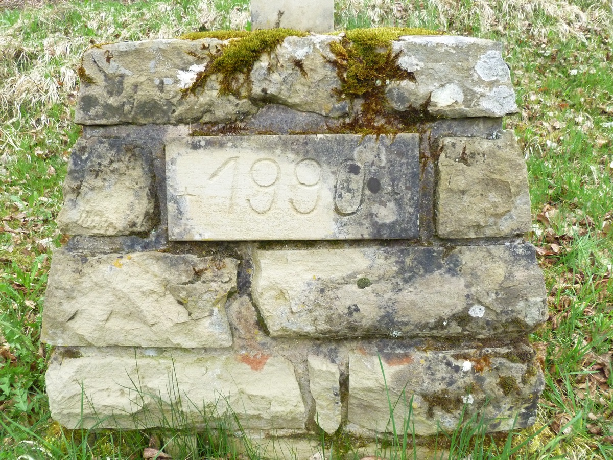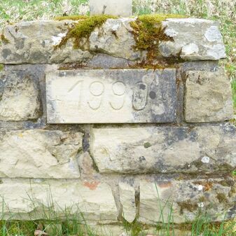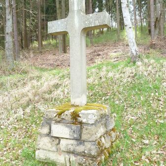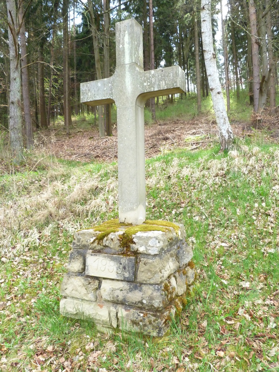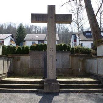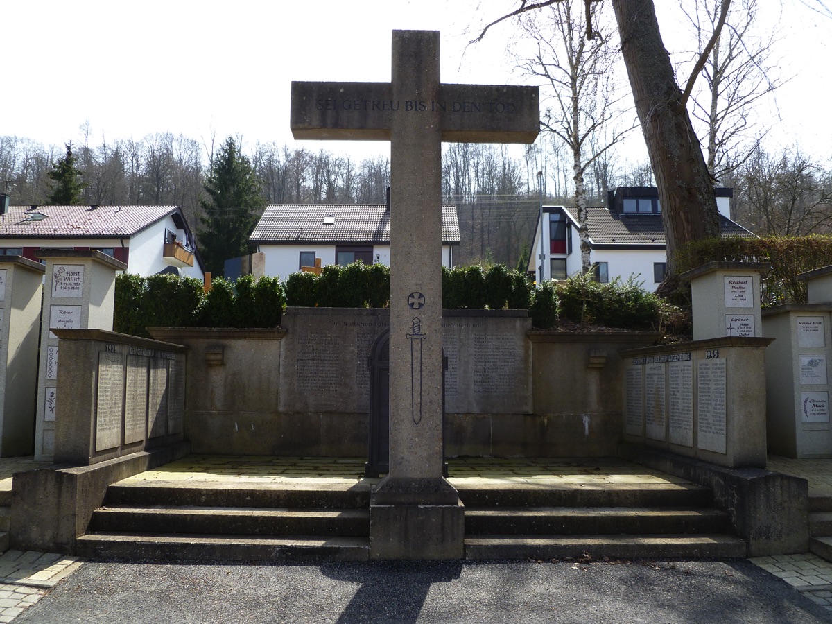 Gefallenendenkmal, bestehend aus einem Steinkreuz mit Inschrift und einer u-förmigen Mauer mit zwölf Platten, auf denen die Lebensdaten der Verstorbenen aufgelistet sind. Drei Stufen führen hinauf und hinter dem Kreuz befindet sich eine Inschrifttafel aus Gusseisen mit halbrundem Abschluss und Relief. Die Inschriften auf den Platten an der Mauer gedenken den Verstorbenen des Ersten und Zweiten Weltkriegs, die Inschrift auf der gusseisernen Platte gedenkt den Gefallenen des Krieges von 1870/71. Gut erhalten, ca. 4m hoch, 6m breit und 3m tief.