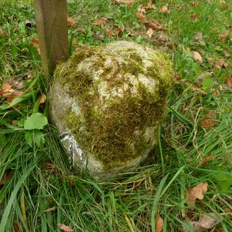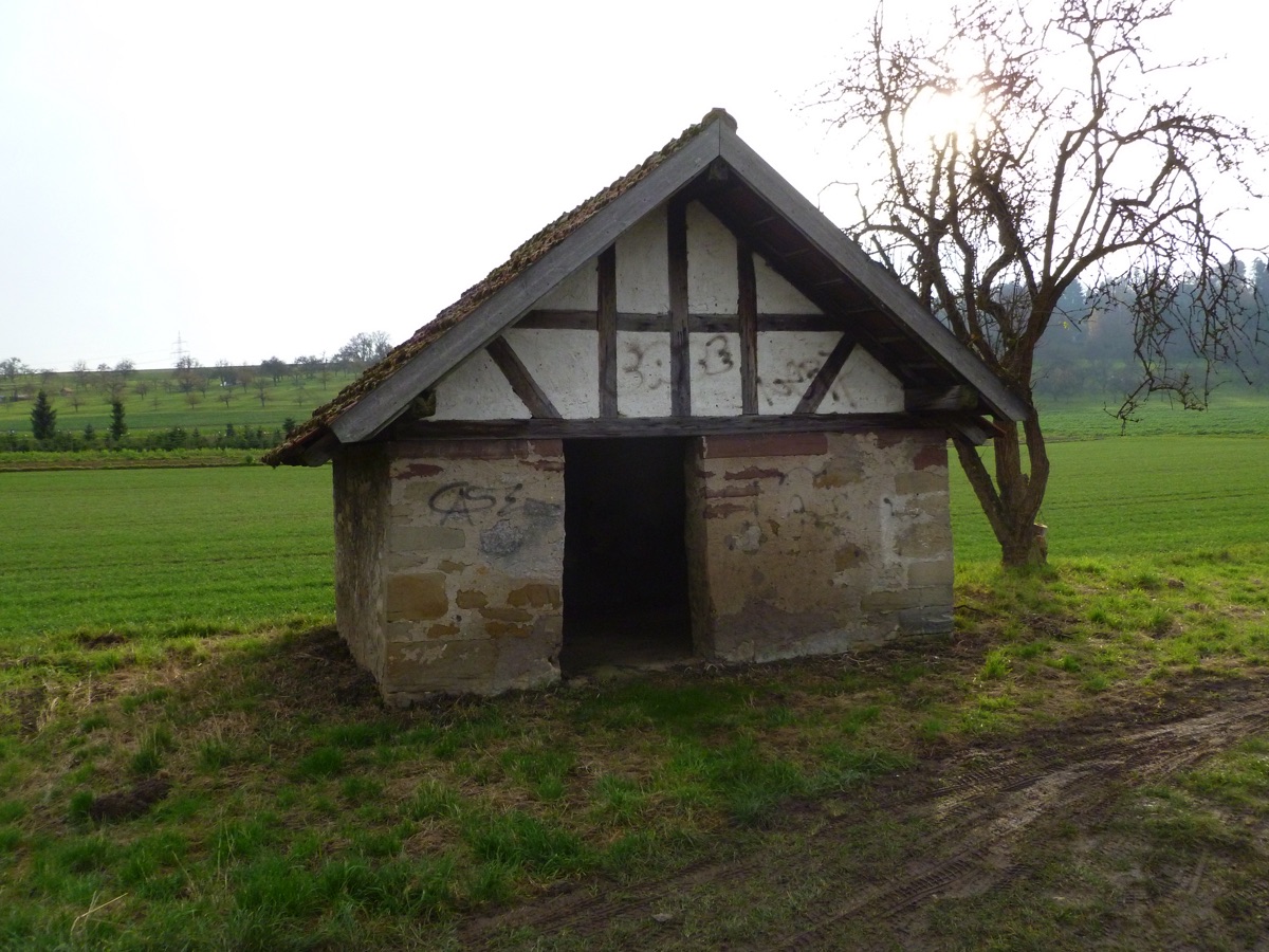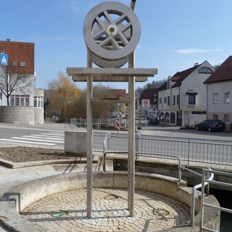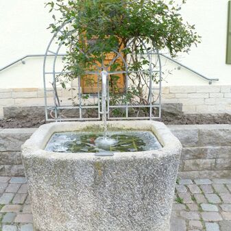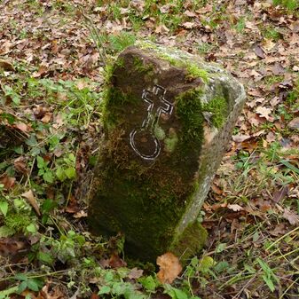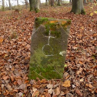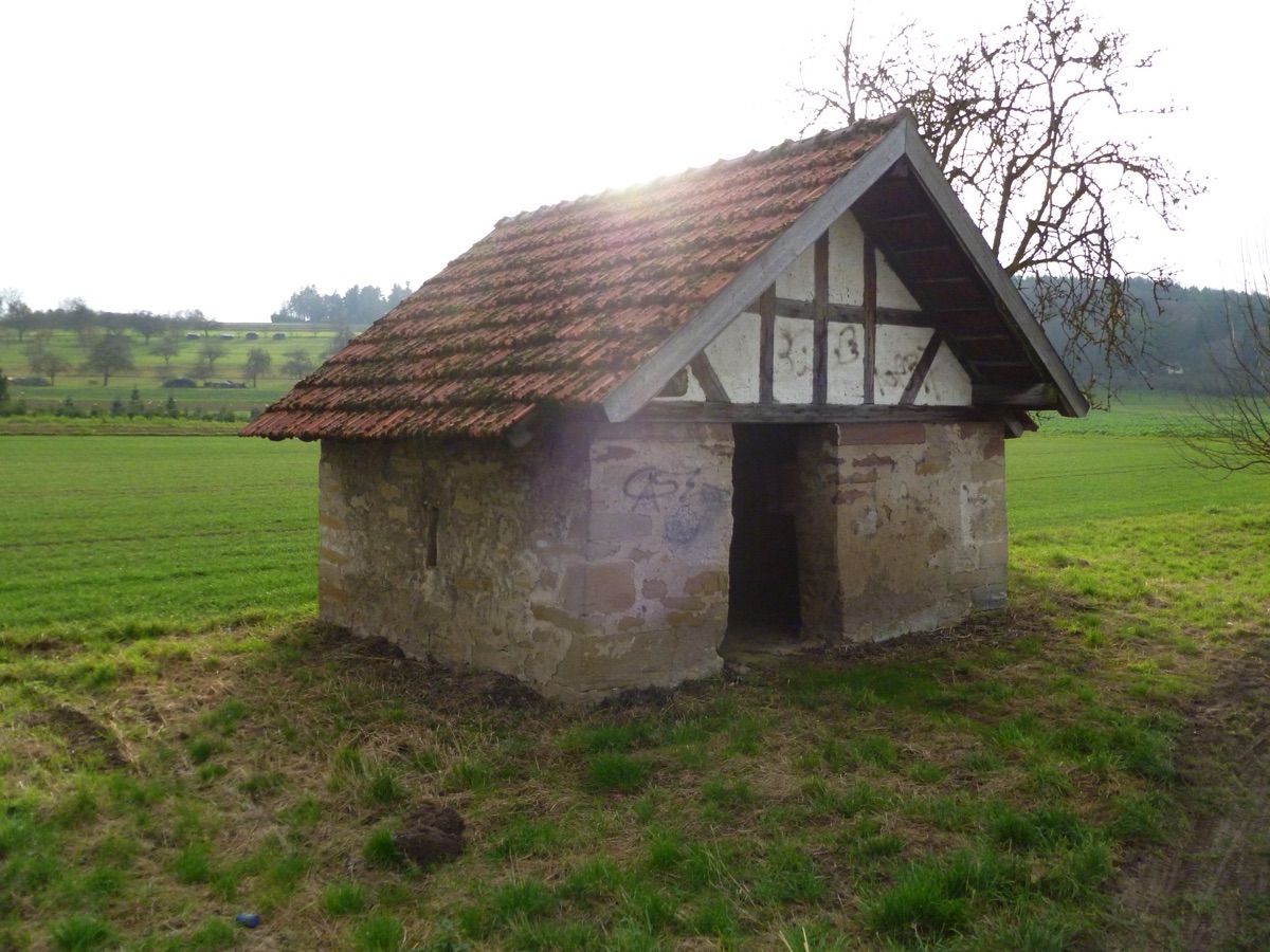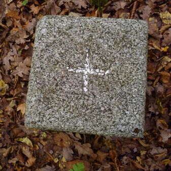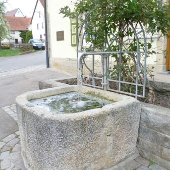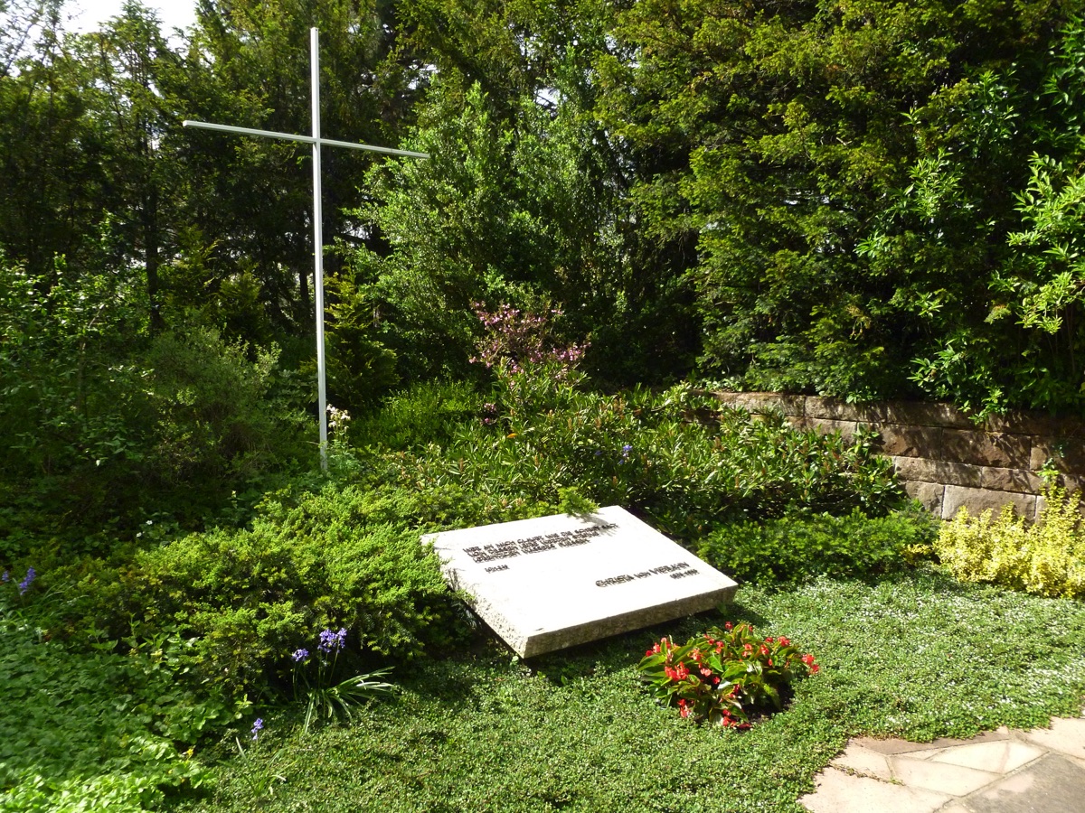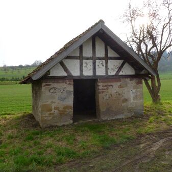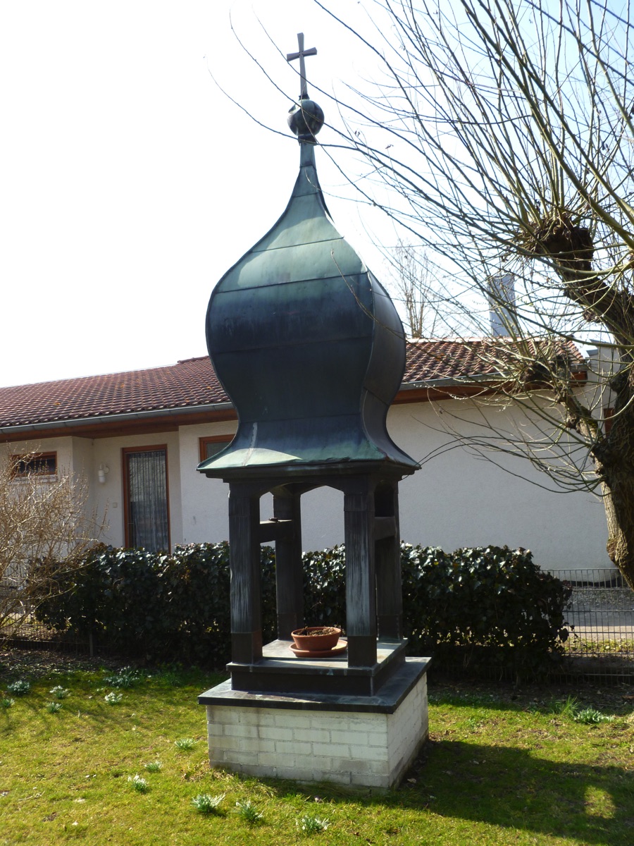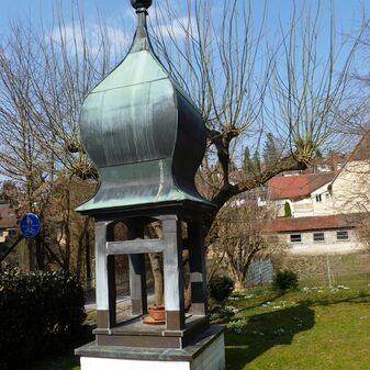 Gefallenendenkmal, bestehend aus einem Steinkreuz mit Inschrift und einer u-förmigen Mauer mit zwölf Platten, auf denen die Lebensdaten der Verstorbenen aufgelistet sind. Drei Stufen führen hinauf und hinter dem Kreuz befindet sich eine Inschrifttafel aus Gusseisen mit halbrundem Abschluss und Relief. Die Inschriften auf den Platten an der Mauer gedenken den Verstorbenen des Ersten und Zweiten Weltkriegs, die Inschrift auf der gusseisernen Platte gedenkt den Gefallenen des Krieges von 1870/71. Gut erhalten, ca. 4m hoch, 6m breit und 3m tief.