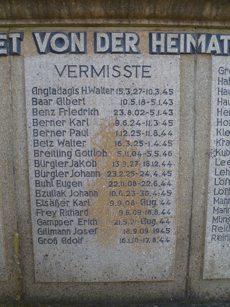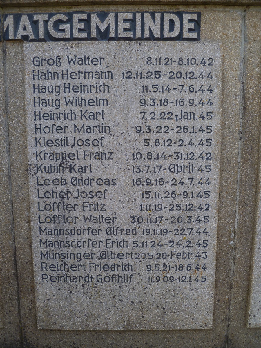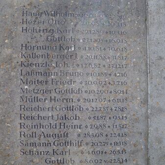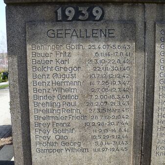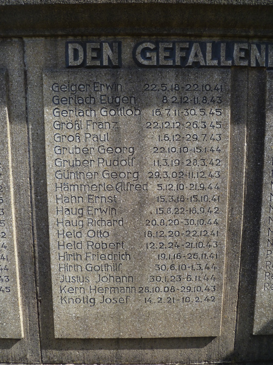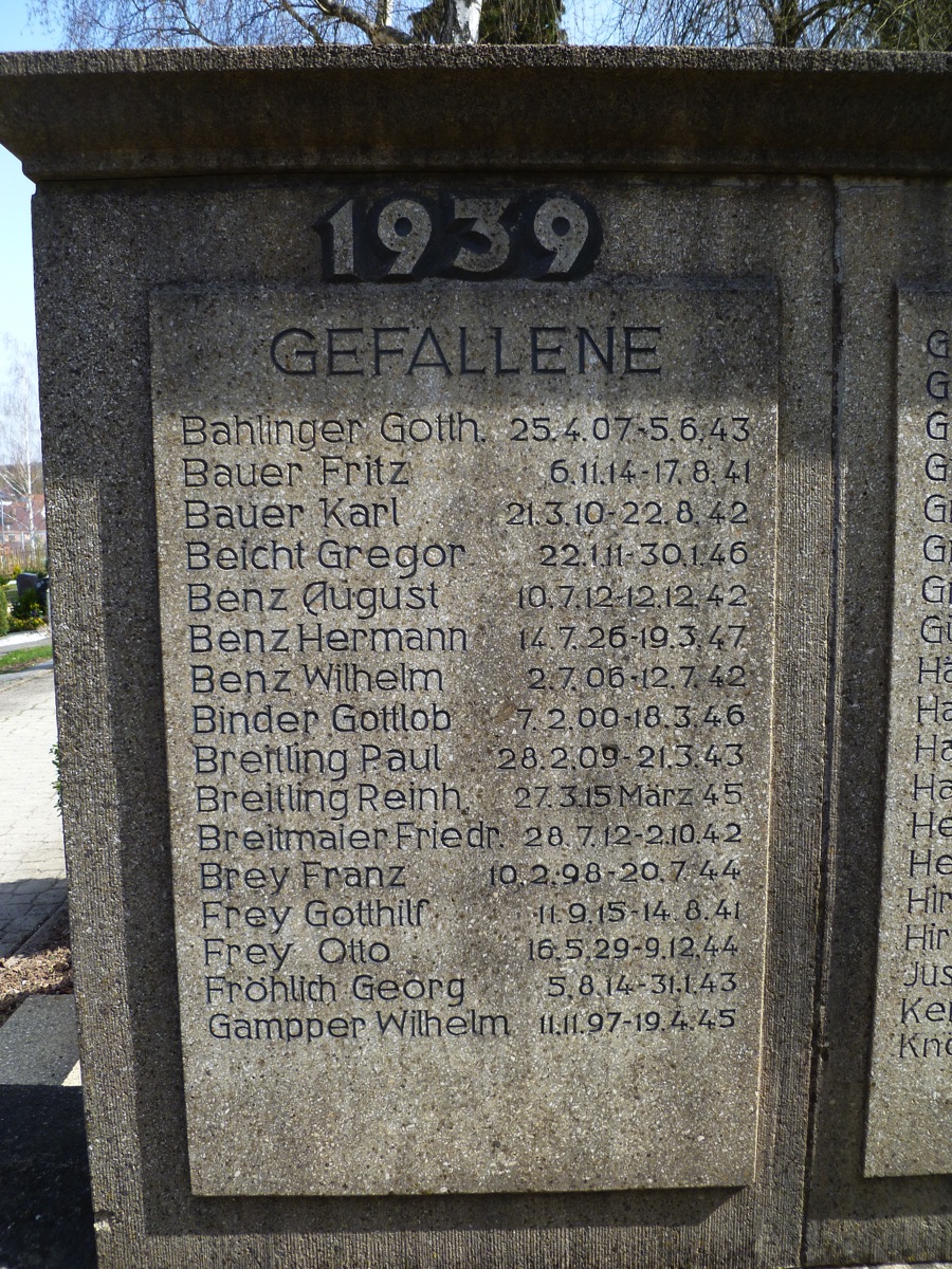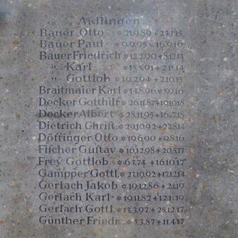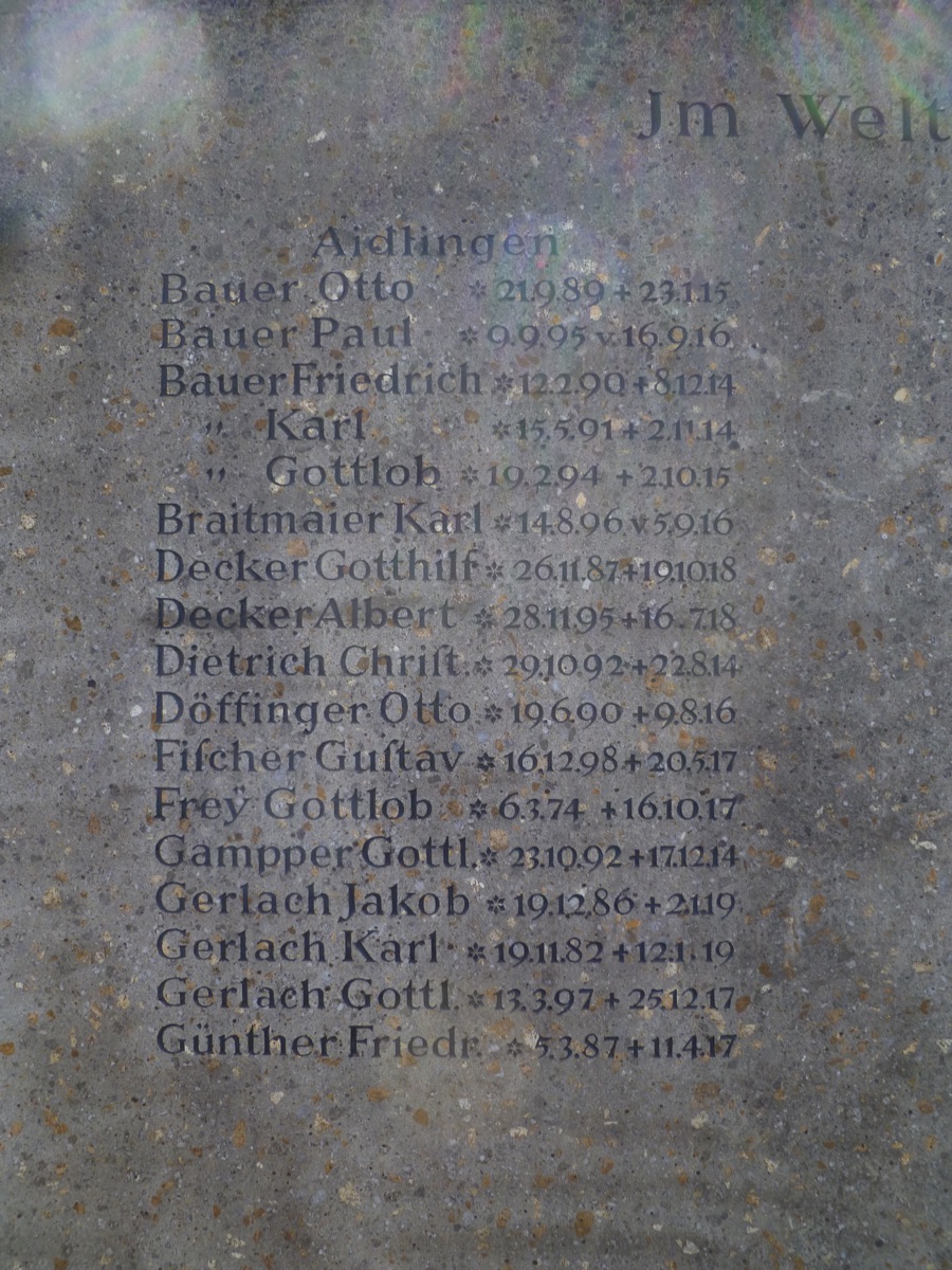 SEI GETREU BIS IN DEN TOD // DEN GEFALLENEN UND VERMISSTEN / 1939 / GEFALLENE / BAHLINGER GOTTH. 25.04.07 - 5.6.43 / [...] // IM WELTKRIEG 1914 - 1918 STARBEN FÜR IHR VATERLAND / AIDLINGEN / BAUER OTTO *21.09.89 +23.1.15 / [...] // GEWIDMET VON DER HEIMATGEMEINDE / SCHNEIDER RICHARD 16.3.08 - 22.09.44 / [...] // ZUM EHRENDEN ANDENKEN / DER IM KRIEG VON 1870/71. / GEGEN FRANKREICH GEFALLENEN / SOLDATEN VON HIER: / JOHANNES POPP [...]