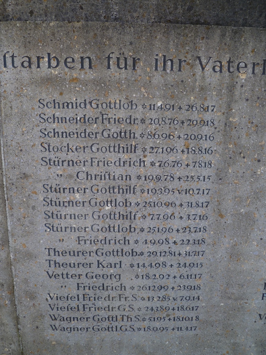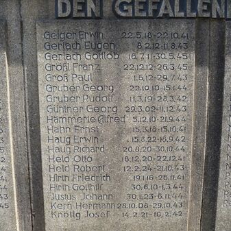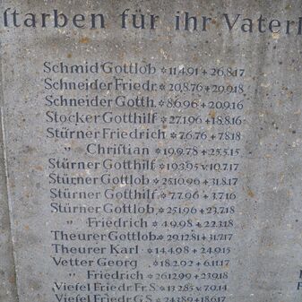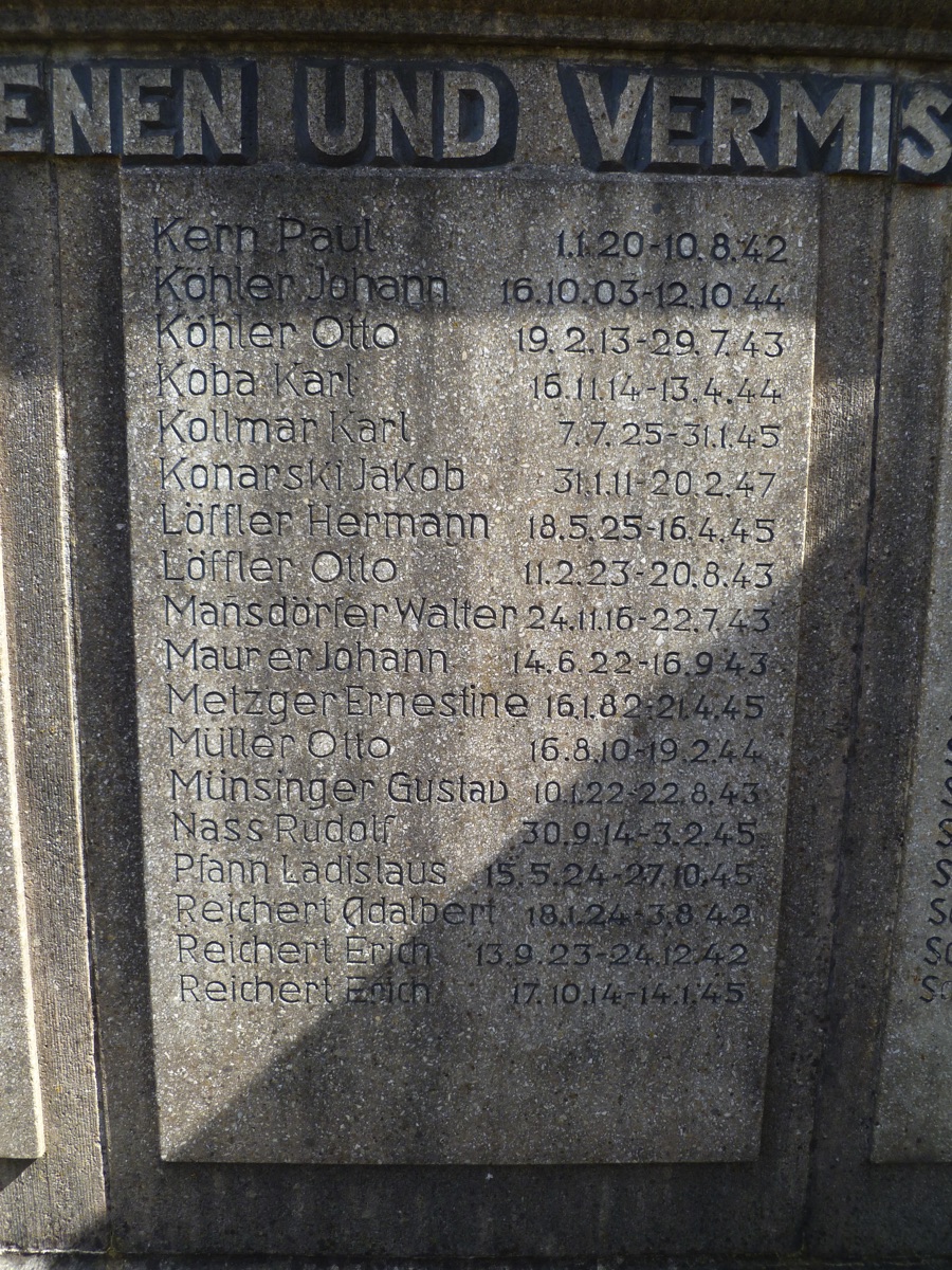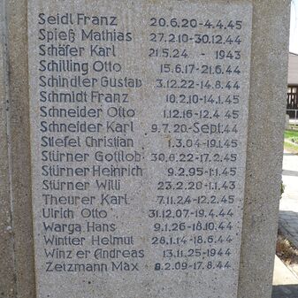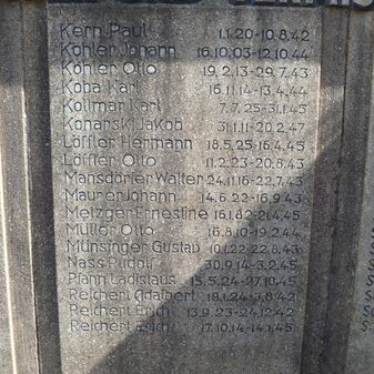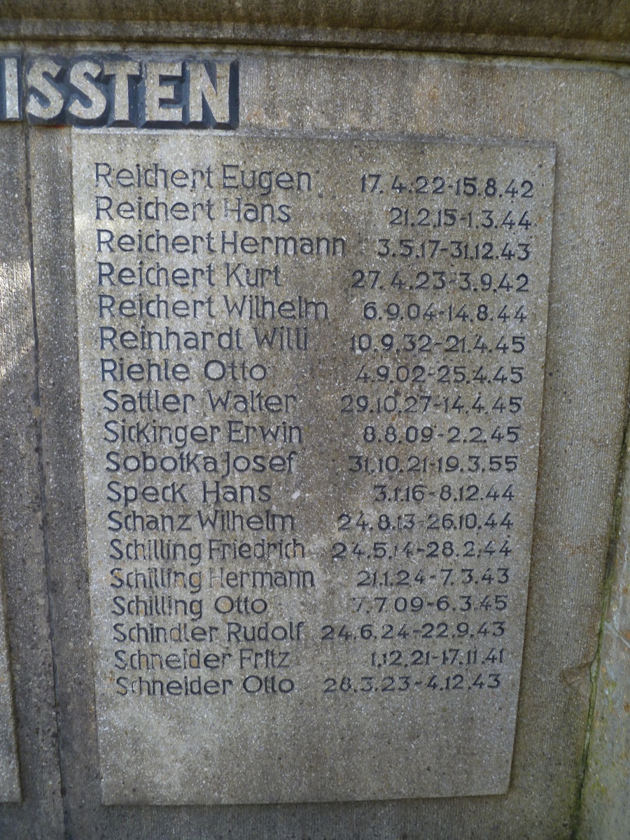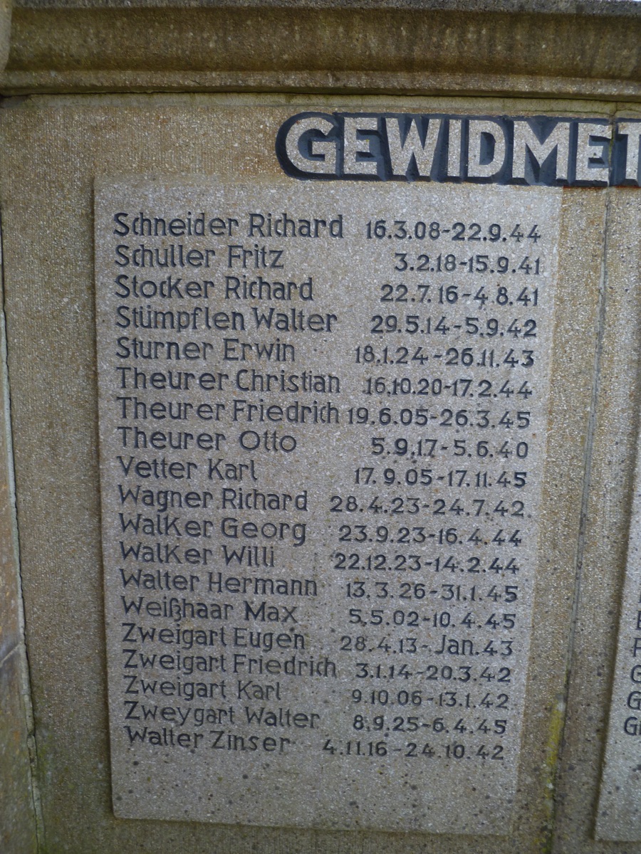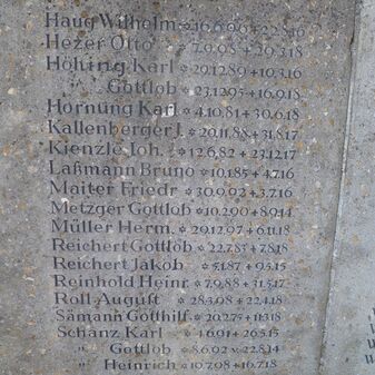 SEI GETREU BIS IN DEN TOD // DEN GEFALLENEN UND VERMISSTEN / 1939 / GEFALLENE / BAHLINGER GOTTH. 25.04.07 - 5.6.43 / [...] // IM WELTKRIEG 1914 - 1918 STARBEN FÜR IHR VATERLAND / AIDLINGEN / BAUER OTTO *21.09.89 +23.1.15 / [...] // GEWIDMET VON DER HEIMATGEMEINDE / SCHNEIDER RICHARD 16.3.08 - 22.09.44 / [...] // ZUM EHRENDEN ANDENKEN / DER IM KRIEG VON 1870/71. / GEGEN FRANKREICH GEFALLENEN / SOLDATEN VON HIER: / JOHANNES POPP [...]