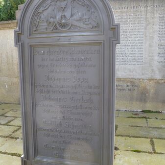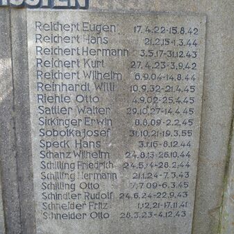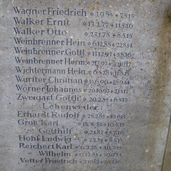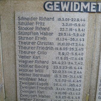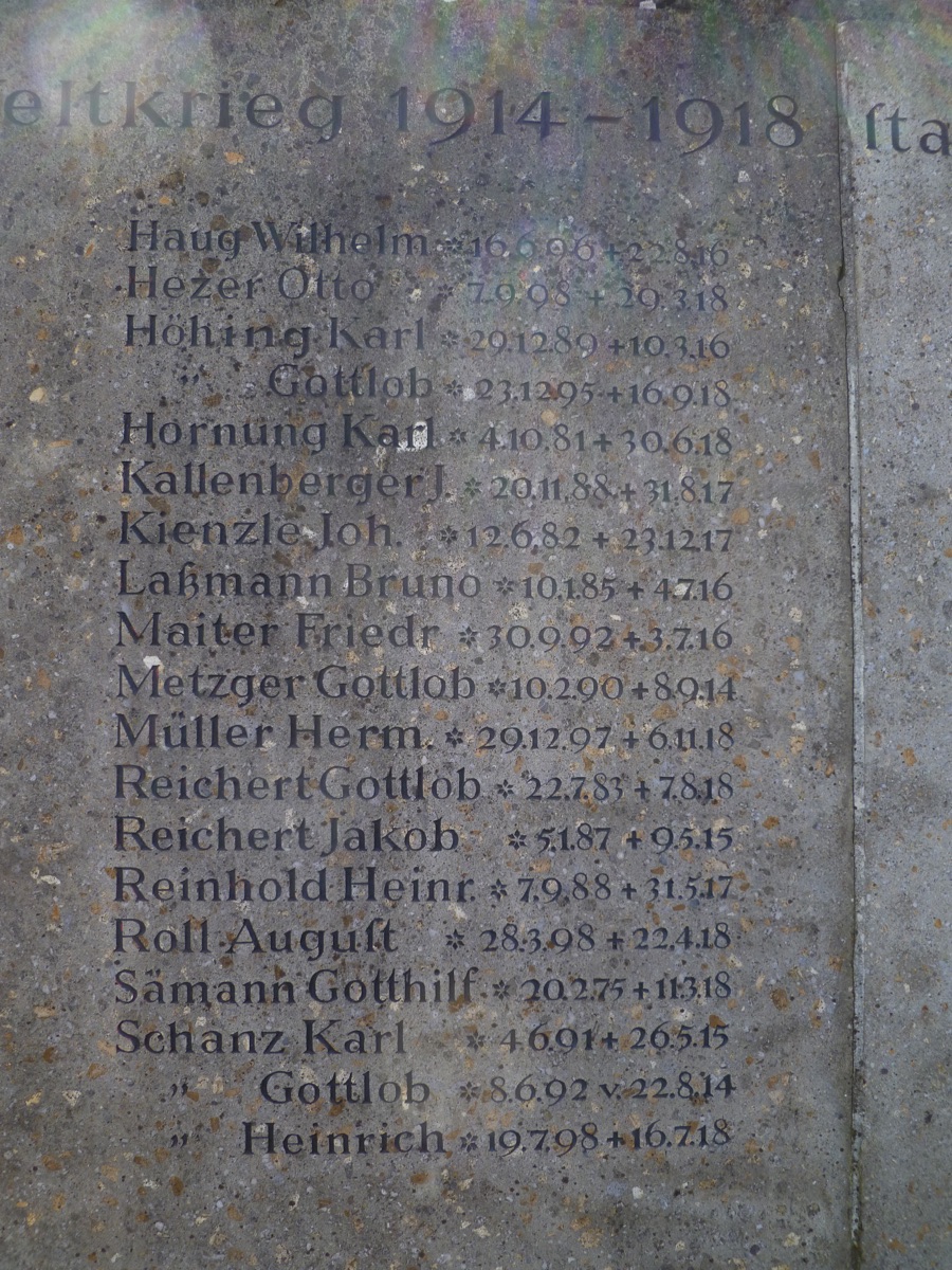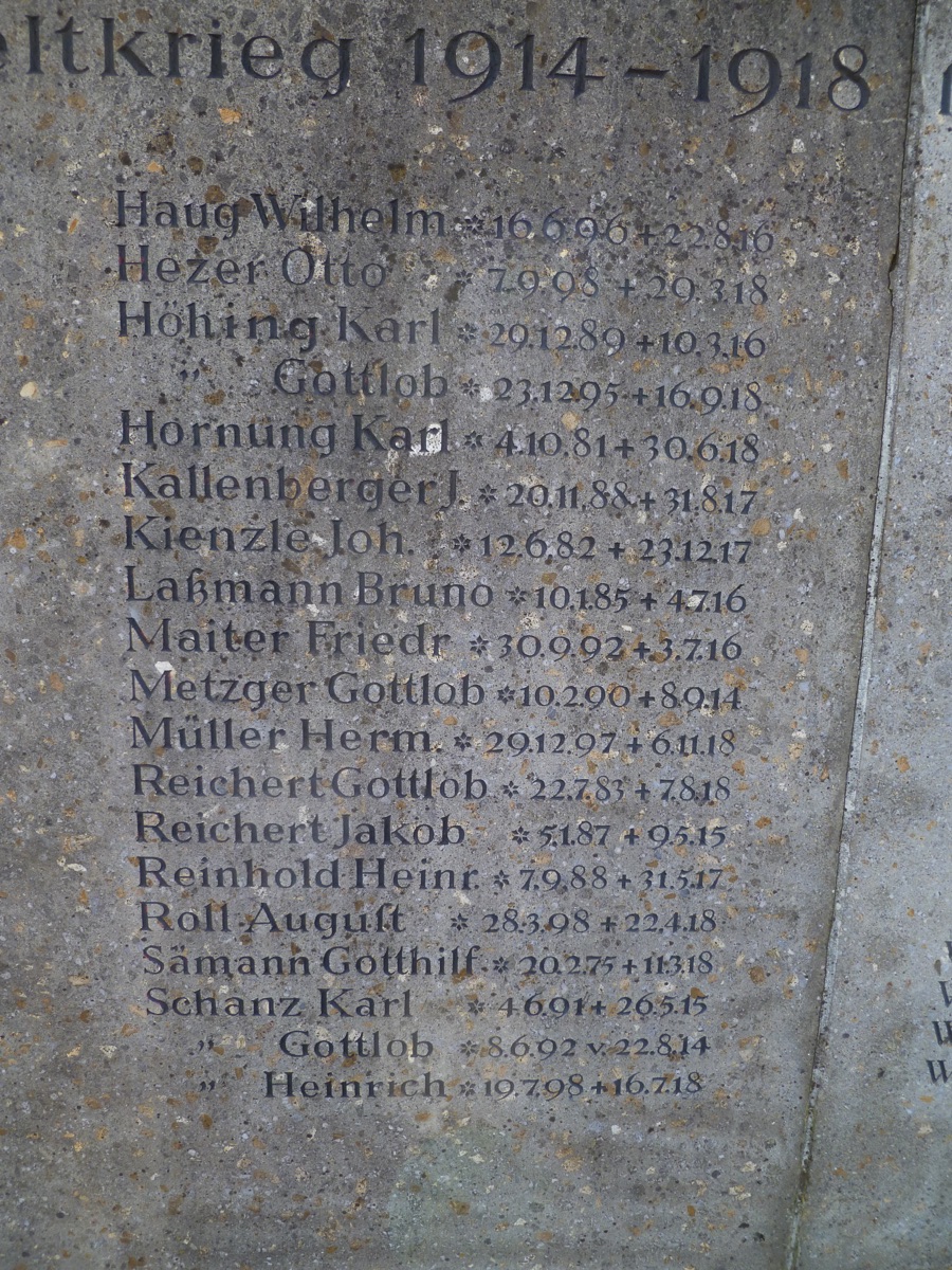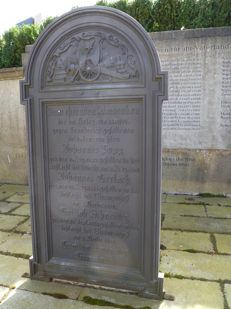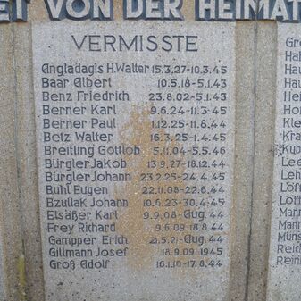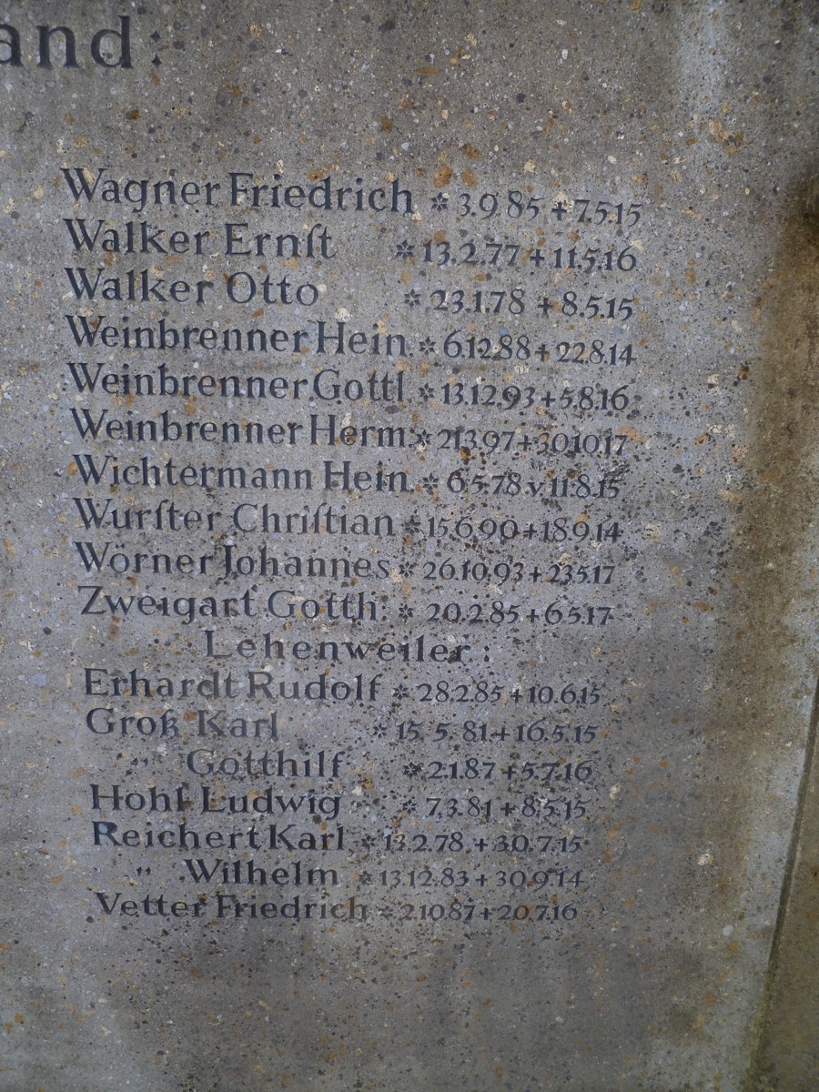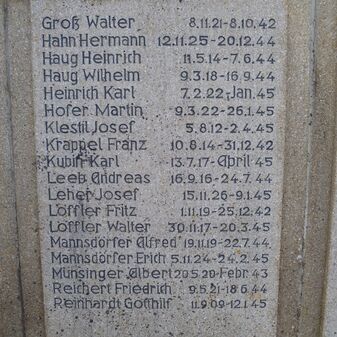 SEI GETREU BIS IN DEN TOD // DEN GEFALLENEN UND VERMISSTEN / 1939 / GEFALLENE / BAHLINGER GOTTH. 25.04.07 - 5.6.43 / [...] // IM WELTKRIEG 1914 - 1918 STARBEN FÜR IHR VATERLAND / AIDLINGEN / BAUER OTTO *21.09.89 +23.1.15 / [...] // GEWIDMET VON DER HEIMATGEMEINDE / SCHNEIDER RICHARD 16.3.08 - 22.09.44 / [...] // ZUM EHRENDEN ANDENKEN / DER IM KRIEG VON 1870/71. / GEGEN FRANKREICH GEFALLENEN / SOLDATEN VON HIER: / JOHANNES POPP [...]