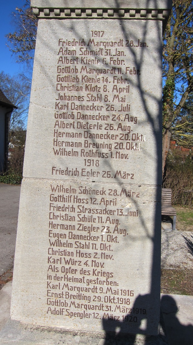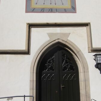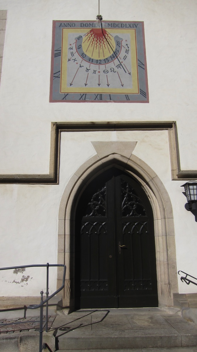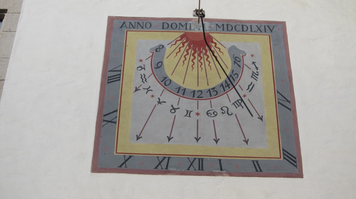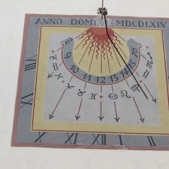An der Südfassade der evangelischen Kirche befindet sich seit 1738 eine Sonnenuhr über dem Portal. Die nur gering beschädigte 2mhohe und breite Uhr ist farbig bemalt und sowohl mit arabischen als auch lateinischen Ziffern, Tierkreiszeichen, angedeuteten Sonnenstrahlen und einer Inschrift versehen; letztere bezieht sich auf die Renovierung im Jahr 1964. Vermutlich gab Herzog Karl Rudolph von Württemberg im Jahr 1738 den Auftrag, das Bildnis des heiligen Christophorus mit einer Sonnenuhr übermalen zu lassen. Man nimmt an, dass die Übermalung des Heiligen das Ziel hatte, einen Rückfall der Bevölkerung in den Katholizismus zu verhindern, nachdem einer Frau, die eine Giftschlange im Haus hatte, in Weil der Stadt empfohlen wurde den bildlich dargestellten heiligen Christopherus anzurufen.