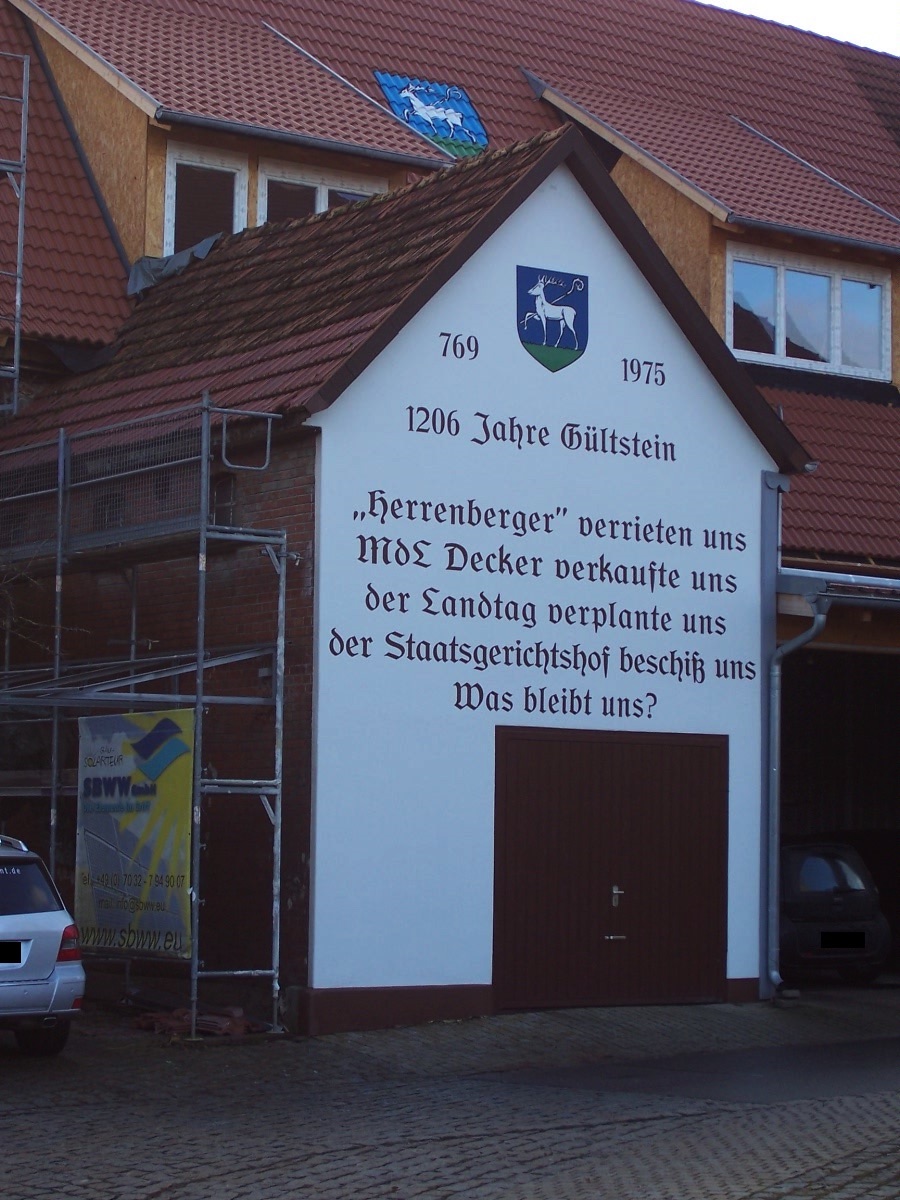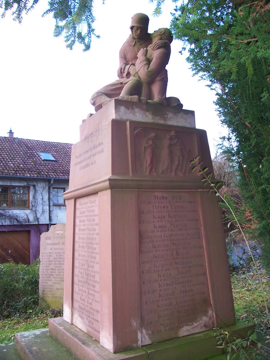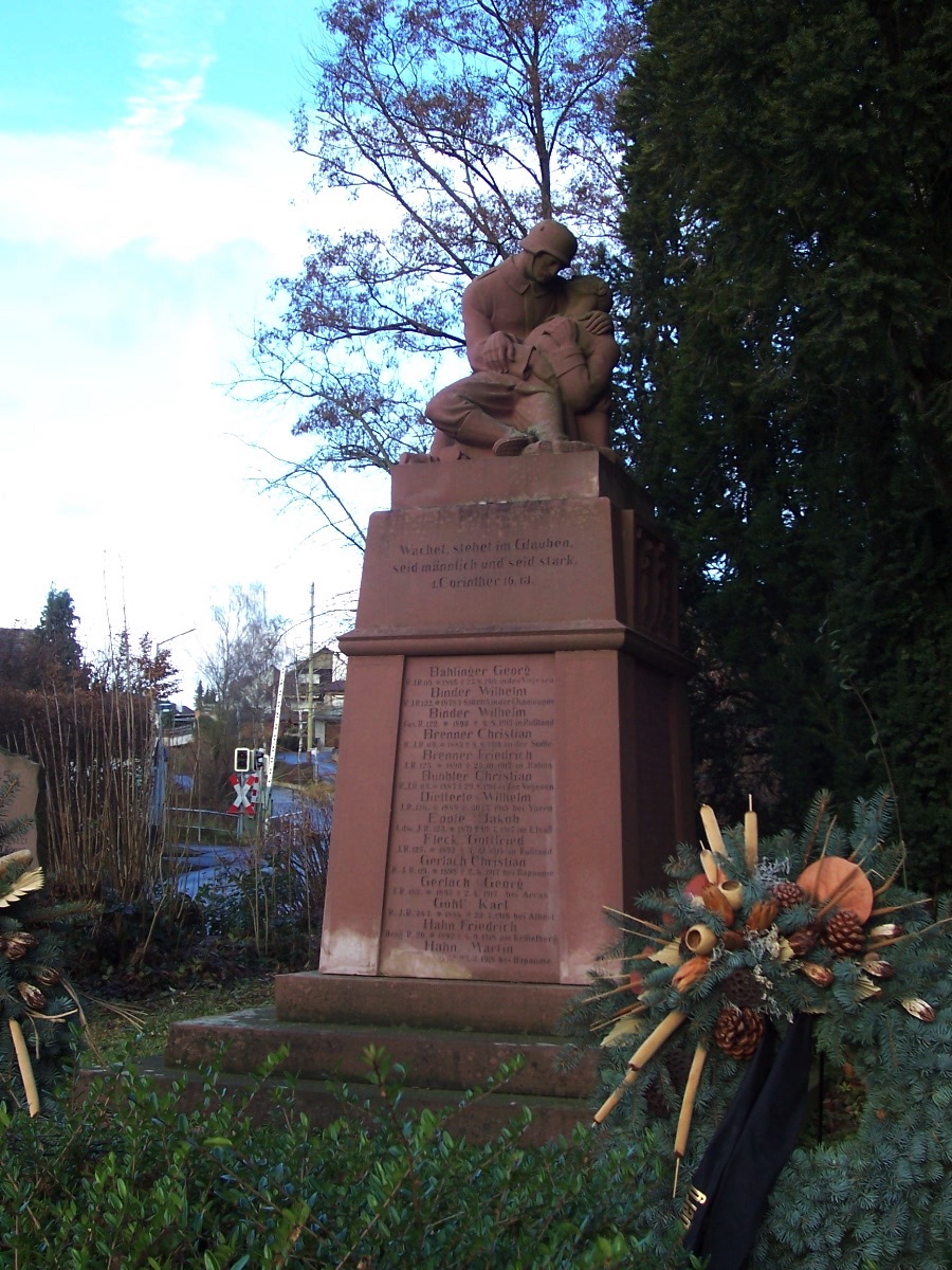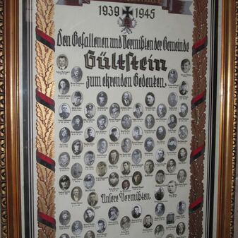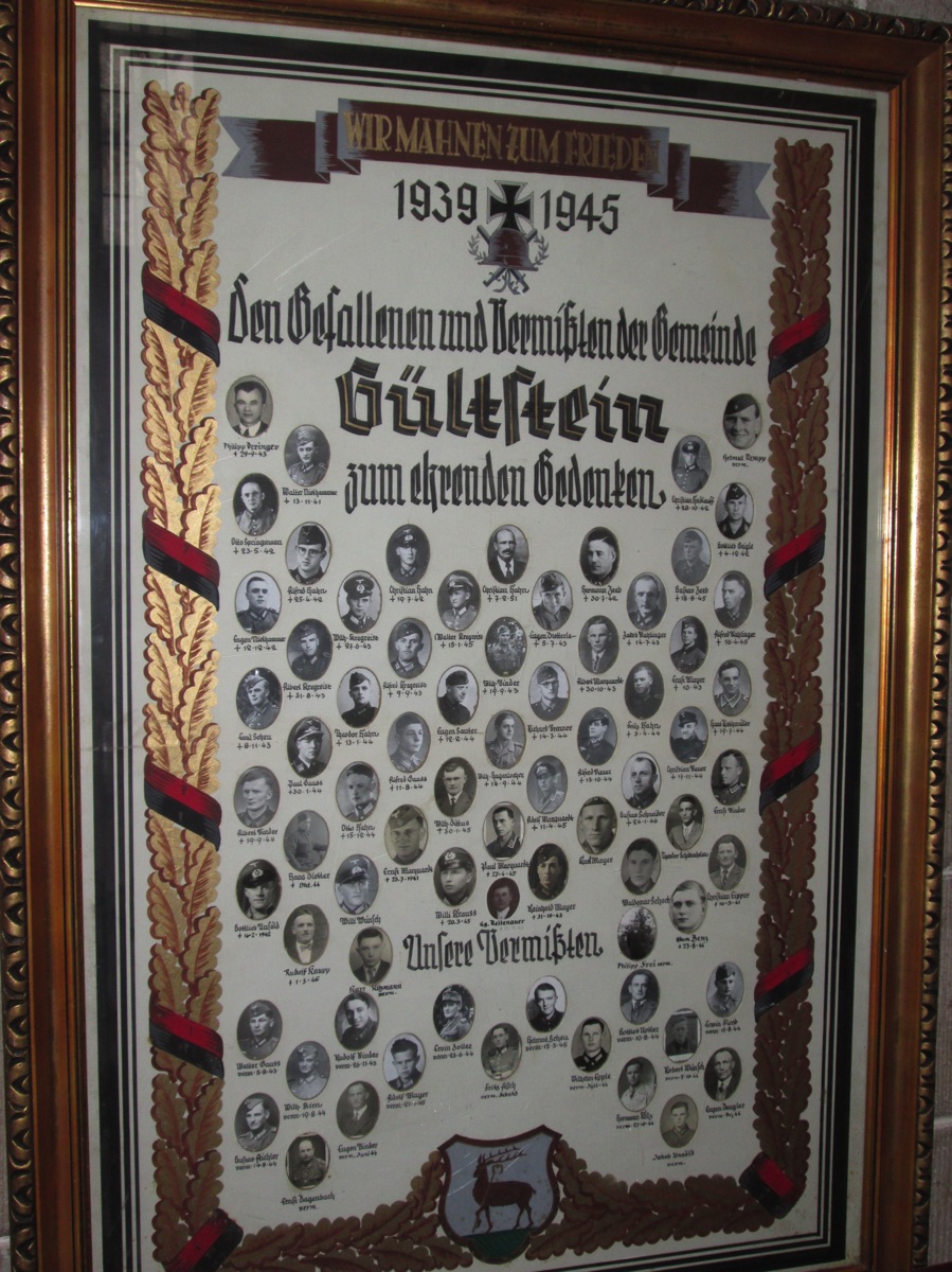 Das Denkmal auf dem alten Friedhof erinnert an die 53 gefallenen und vermissten Bürger aus Gültstein des Ersten Weltkriegs. Es wurde 1924 von der Firma des Bildhauers Gottlob Hiller aus Herrenberg gefertigt und am 11. Mai in einer Feierstunde eingeweiht. Die Skulptur, ein Soldat, der einen sterbenden Kameraden tröstet, befindet sich auf einem Sockel aus rotem Sandstein, der mit Inschriften versehen ist. Das Denkmal ist 3,80m hoch und 3,50m breit wie tief und gut erhalten. 1955 wurde das Denkmal durch die Firma Hiller und dem Bildhauer Thomas Dittus aus Affstätt renoviert. Im gleichen Jahr wurden zwei weitere Gedenktafeln mit den Namen und Daten der Gefallenen und Vermissten des Zweiten Weltkriegs ergänzt. Die Tafeln sind 160cm hoch, 120cm breit und 35cm tief. Am Volkstrauertag findet dort jährlich eine Feierstunde der Gemeinde mit Musikverein, Vertreter der beiden Kirchen, Liederkranz, Kirchenchor und Posaunenchor statt. Außerdem wird ein Kranz an beiden Denkmalen niedergelegt.