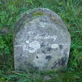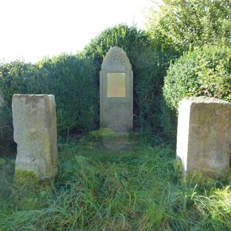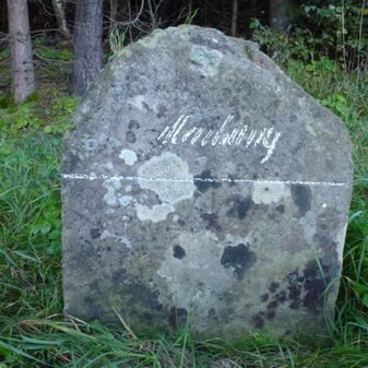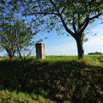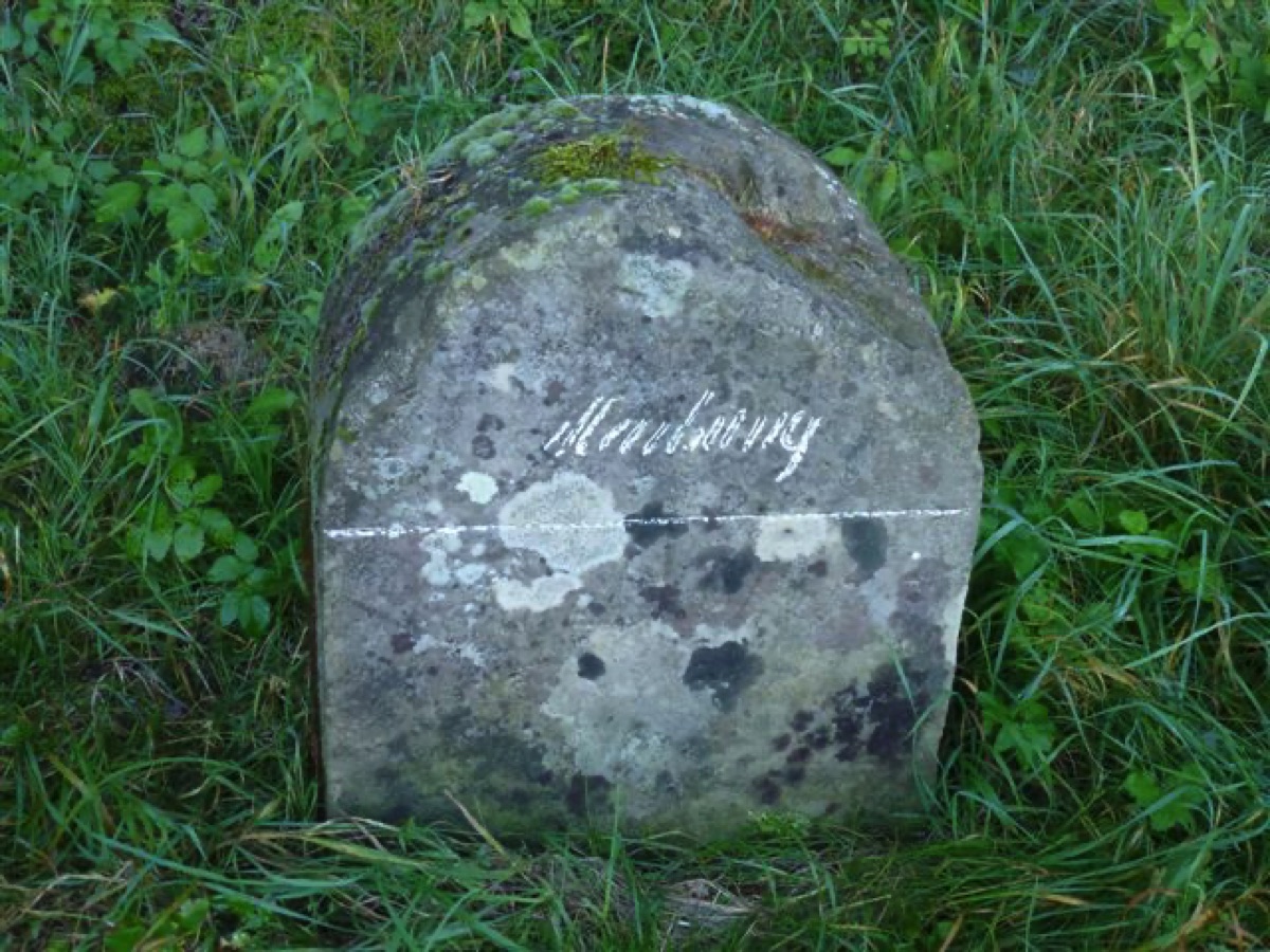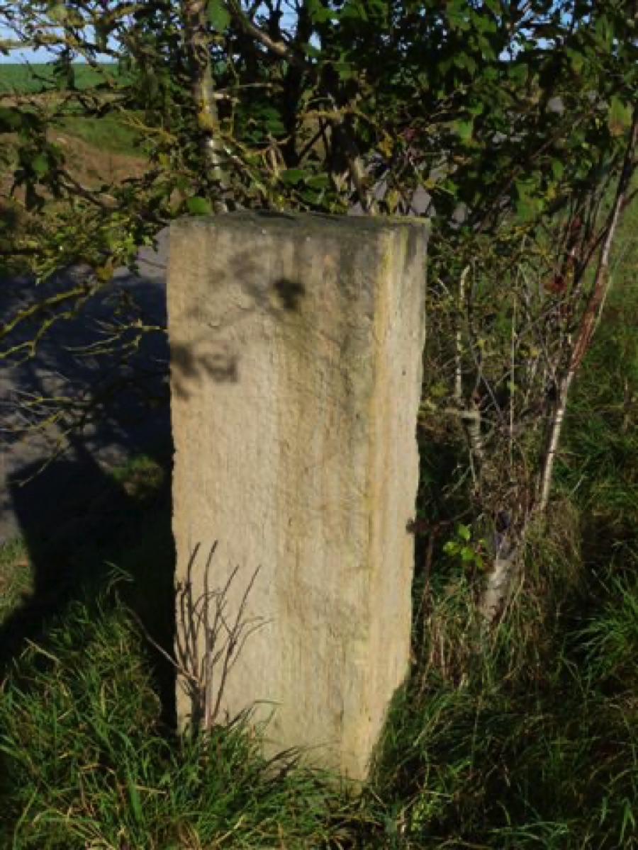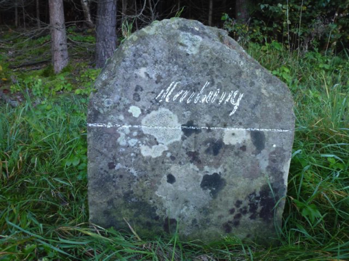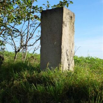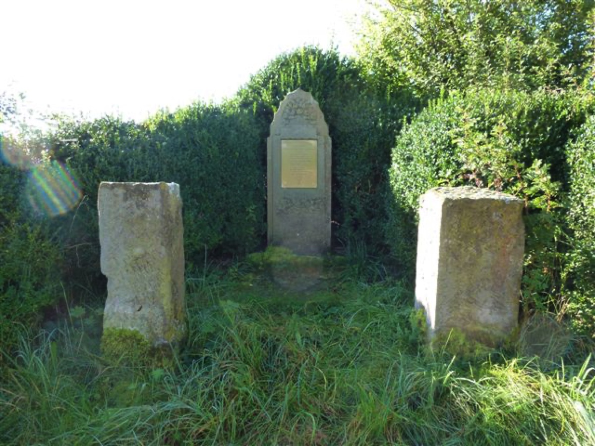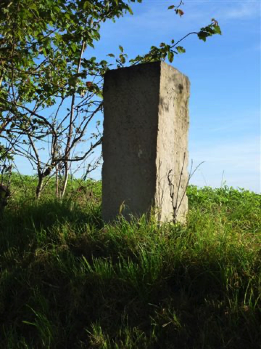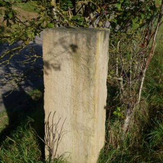 Grenzstein, ohne Beschriftung. Rechteckige Grundform, flacher Kopf, gut erhalten, Sandstein, 120cm hoch, 40cm breit, 45cm tief; Bedeutung unklar, da er auf keiner Gemarkungsgrenze steht.