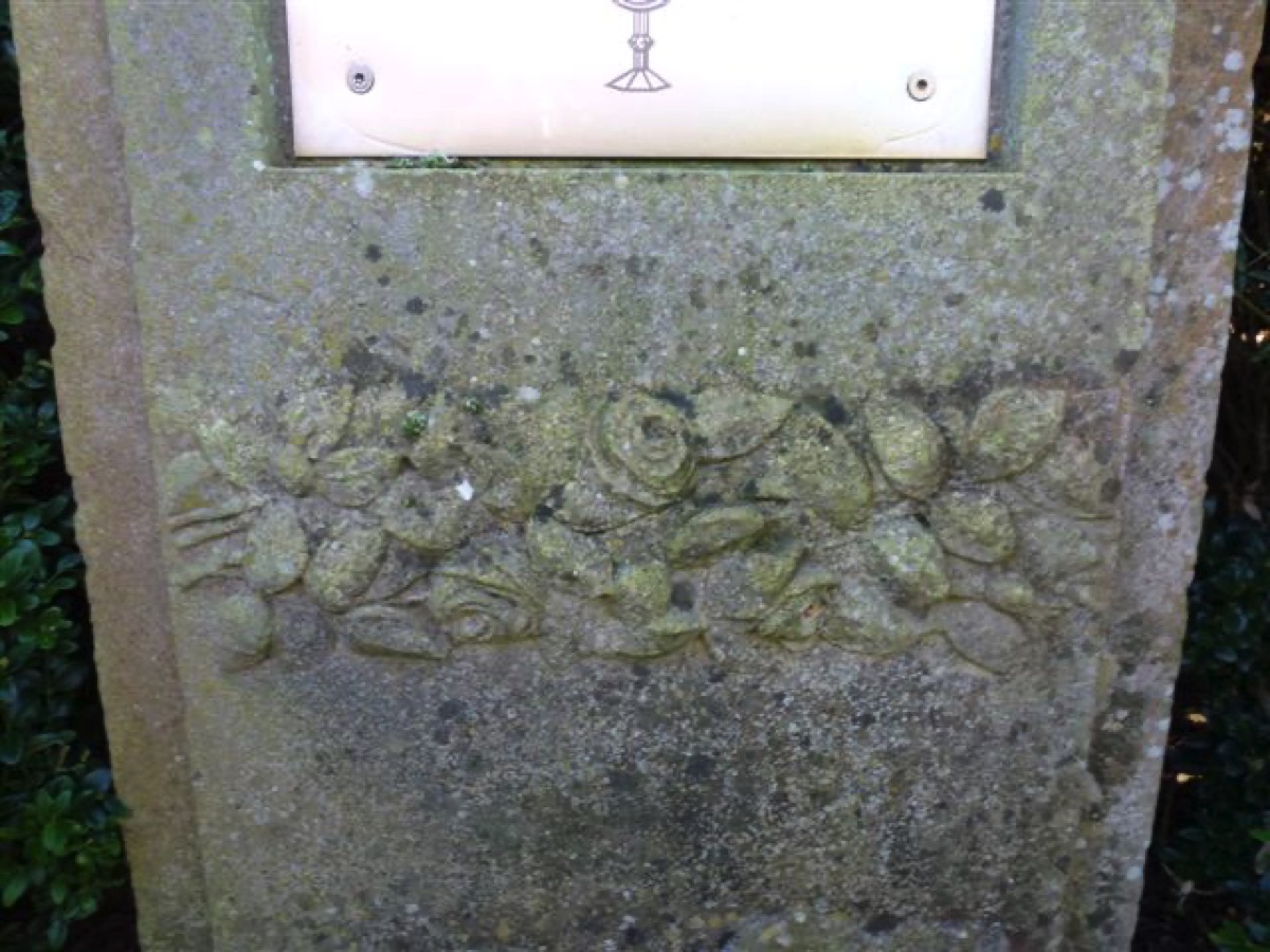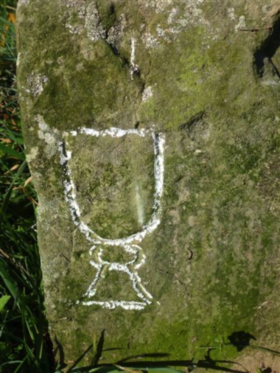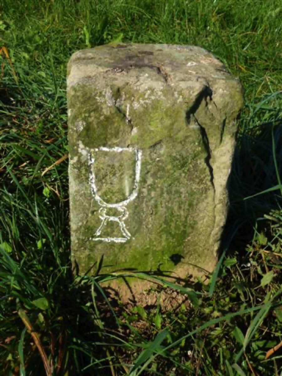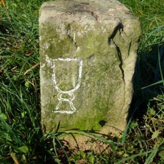 Grenzstein der Gemarkung Unterjettingen und Haslach (zugleich Gemeindegrenze Herrenberg und Jettingen), mit Symbol (Kelch) und abgewinkelter Krinne. Rechteckige Grundform, flacher Kopf, befriedigend erhalten, Sandstein, 35cm hoch, 23cm breit, 21cm tief.