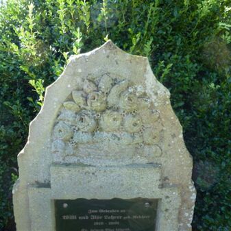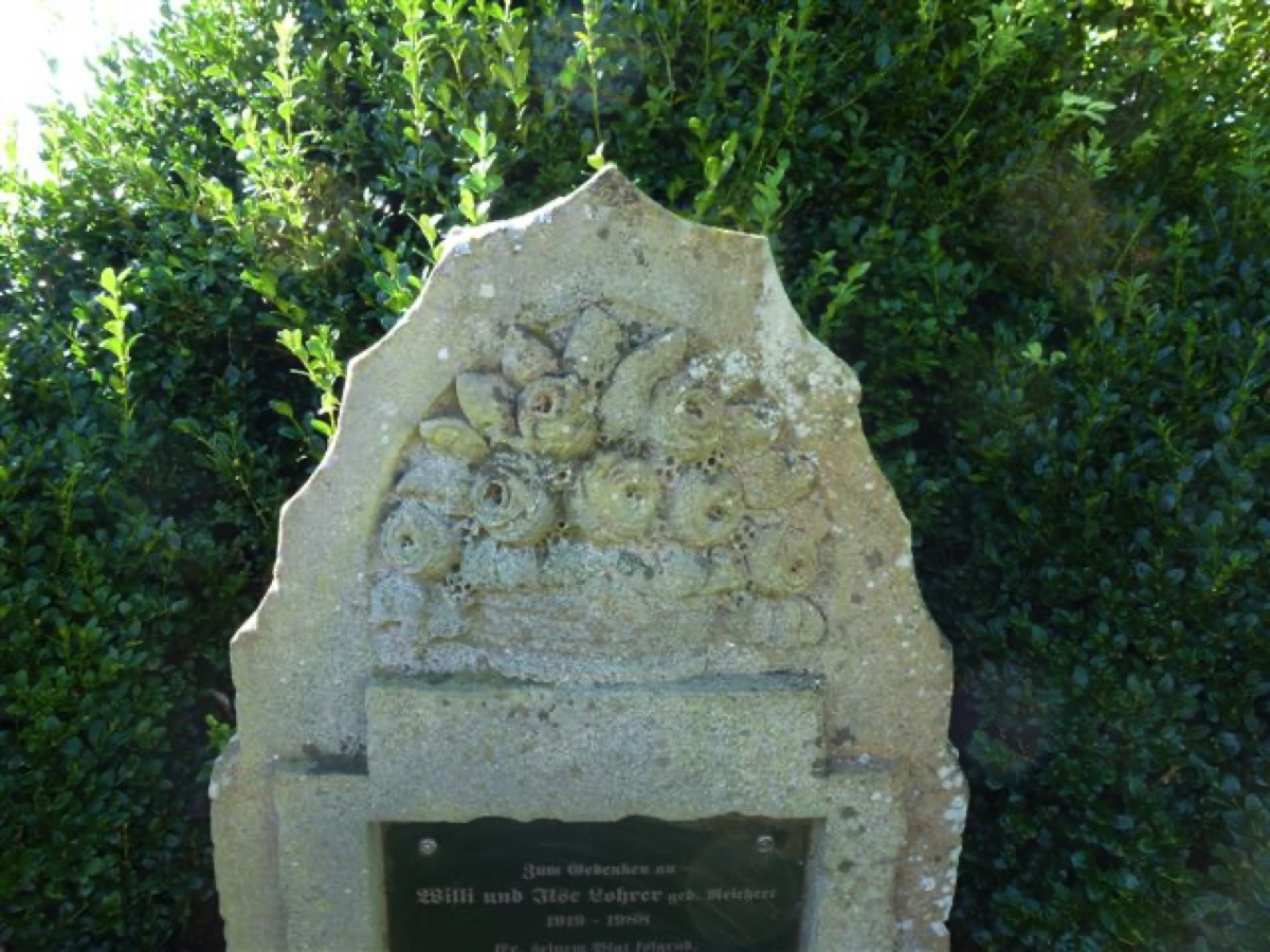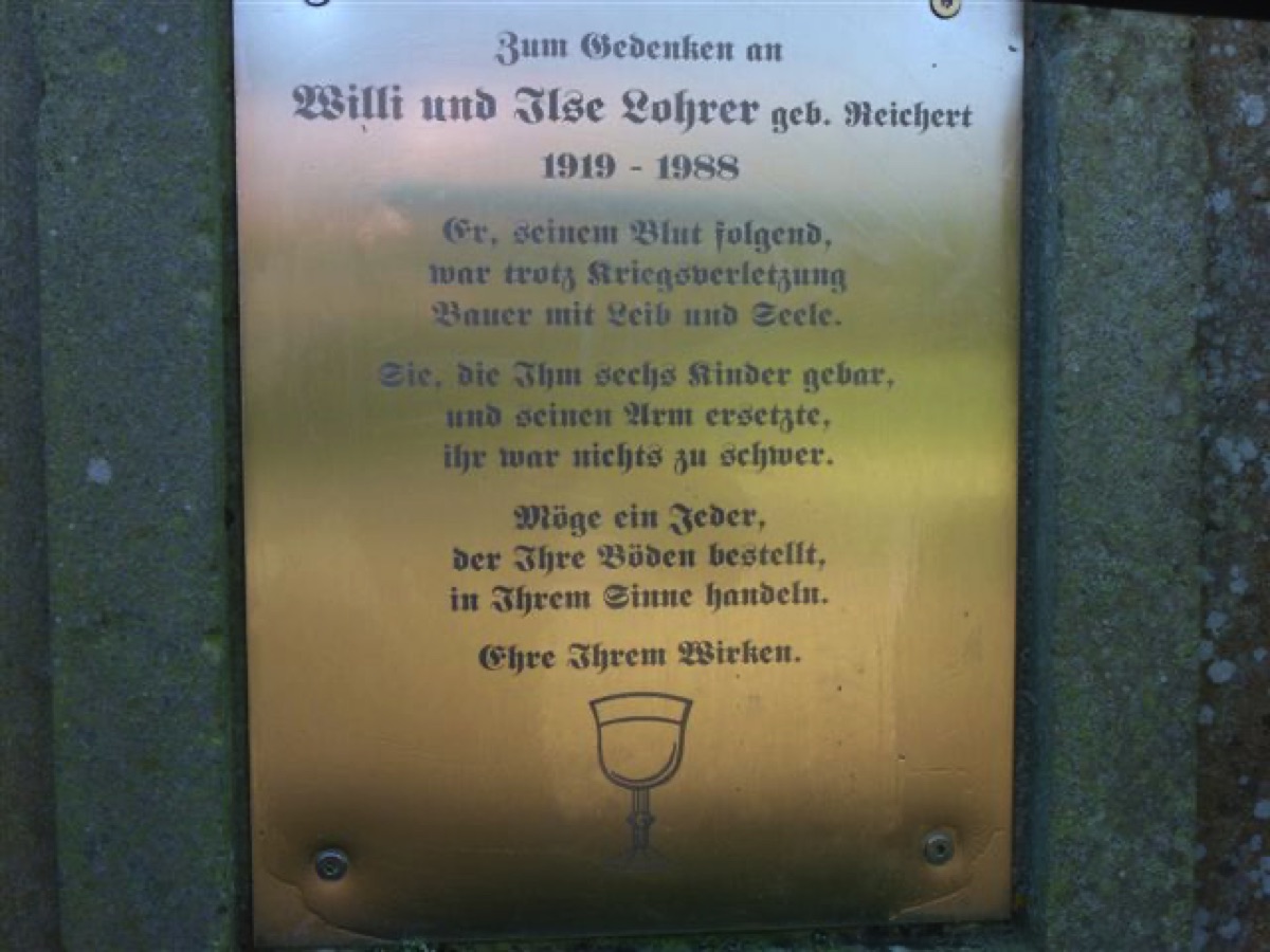 Zum Gedenken an / Willi und Ilse Lohrer geb. Reichert / 1919-1988 / Er, seinem Blut folgend, / war trotz Kriegsverletzung / Bauer mit Leib und Seele. / Sie, die Ihm sechs Kinder gebar, / und seinen Arm ersetzte, / ihr war nichts zu schwer. / Möge ein Jeder, / der Ihre Böden bestellt, in Ihrem Sinne handeln. / Ehre Ihrem Wirken.