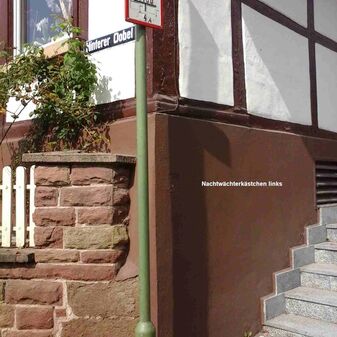 Bauteil „Nachtwächterkästchen“ aus Metall (Stahl), Befriedigend erhalten, 10cm hoch und breit und 3cm tief, aus der Zeit vor 1930, darin befand sich ein Schlüssel für die Stechuhr des früheren Nachtwächters.
