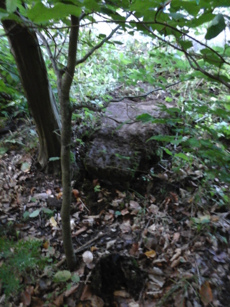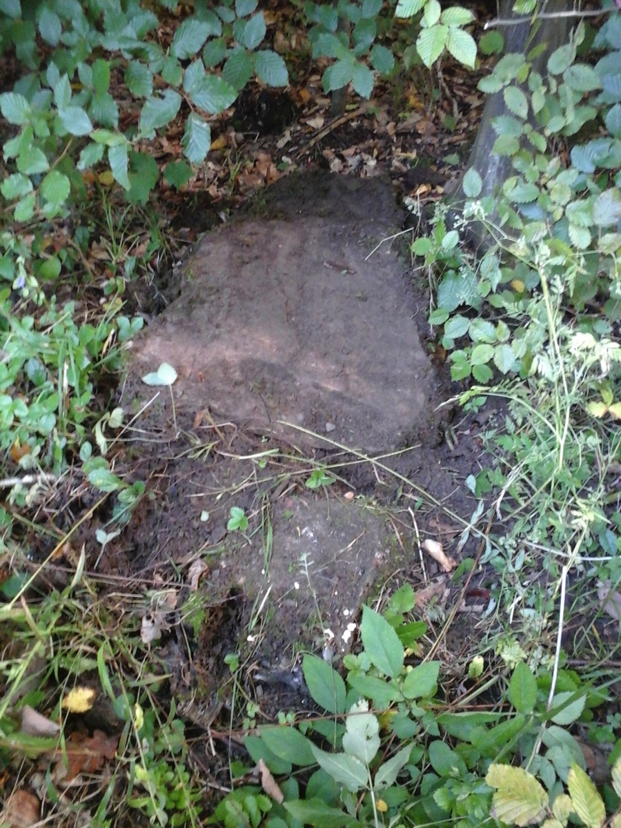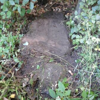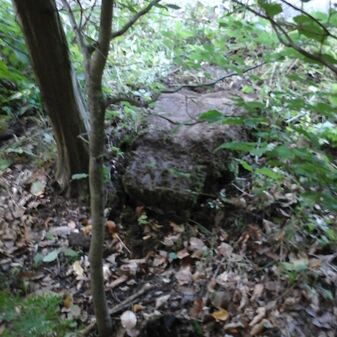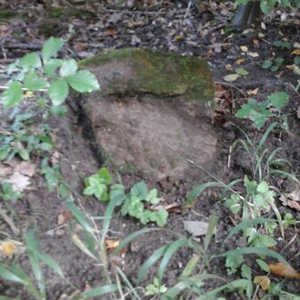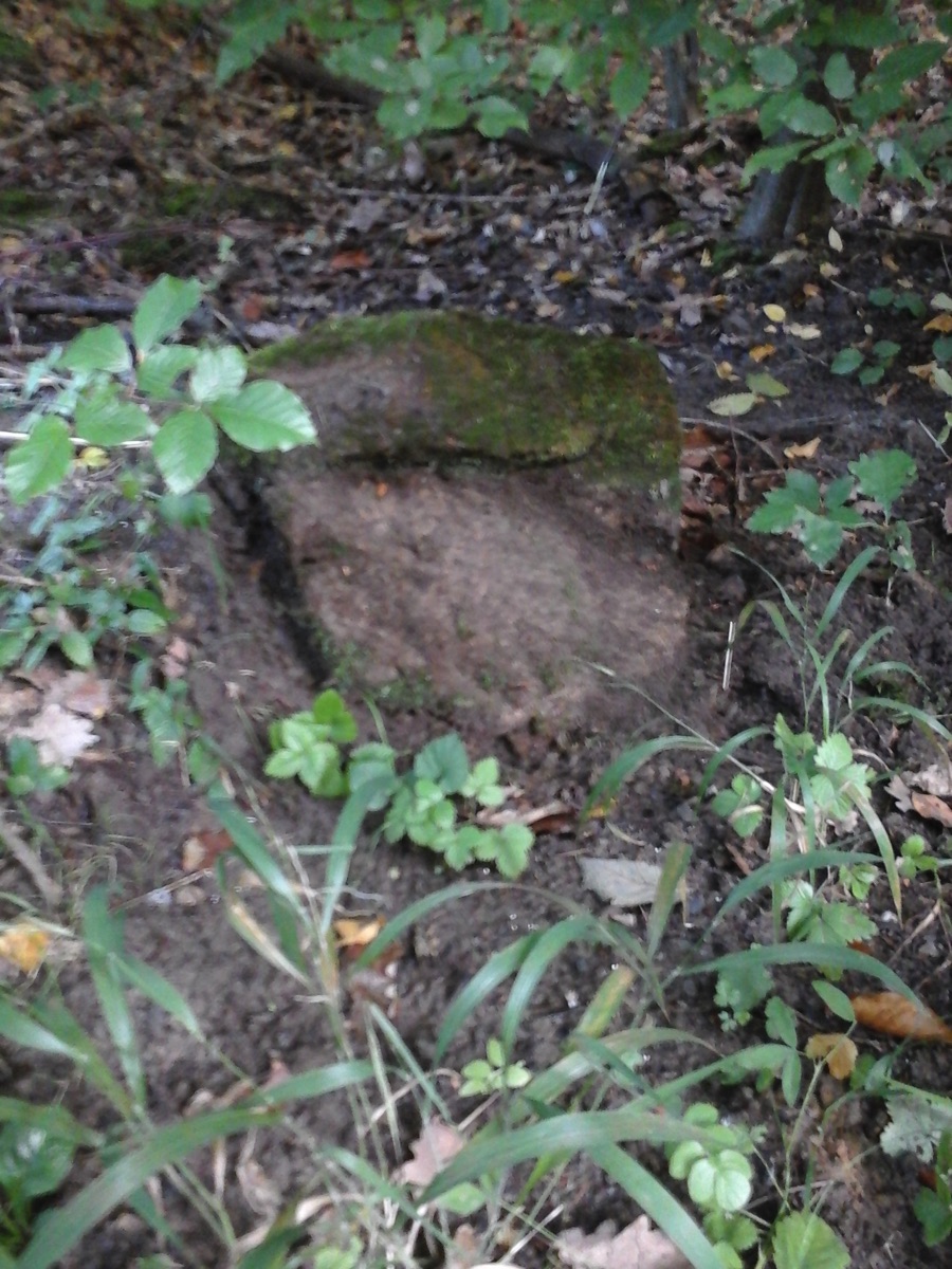 Gemarkungsgrenzstein auf aktuellem Grenzverlauf Gebersheim / Höfingen und Staatswald (beide Gemeinde Leonberg); Dreimärker; Sandstein, rechteckige Grundform, flacher Kopf; abgebrochen, mangelhaft erhalten, 80cm hoch, 30cm breit und tief. Kennzeichnung nicht erkennbar (beschädigt).