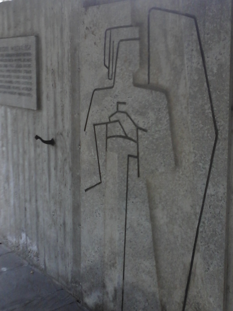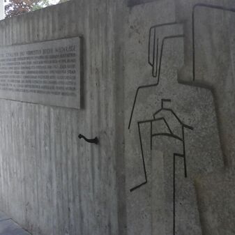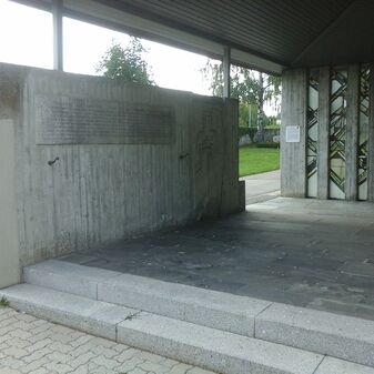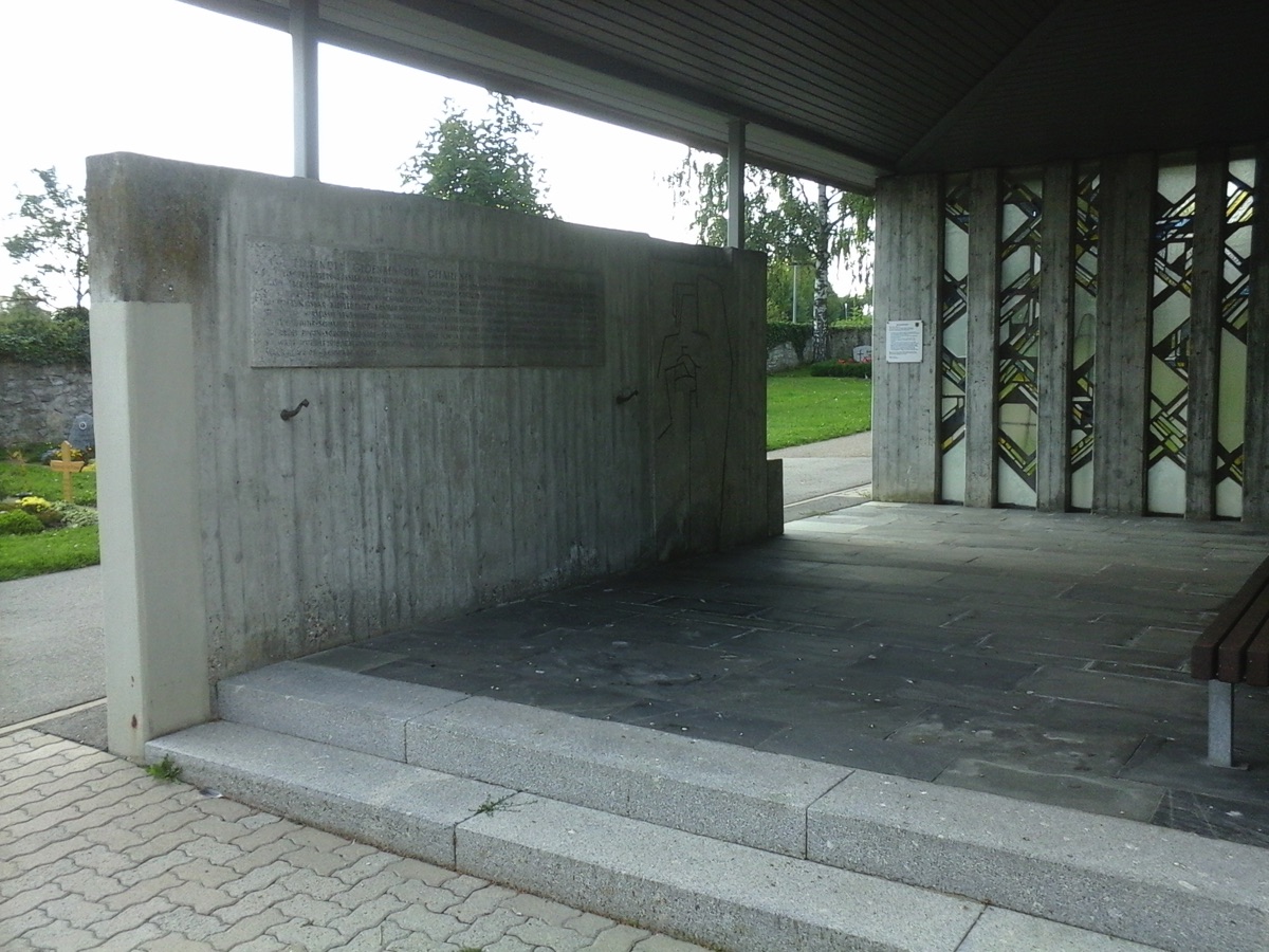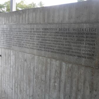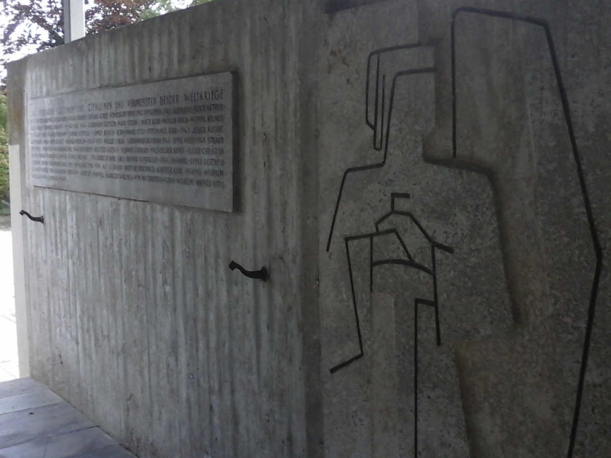 Gefallenendenkmal für die Gefallenen und Vermissten beider Weltkriege, Flachrelief mit Engel, Gedenktafel mit Inschrift (Namen) aus Granit, von 1969. Sehr gut erhalten, 180cm hoch, 5m breit.