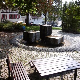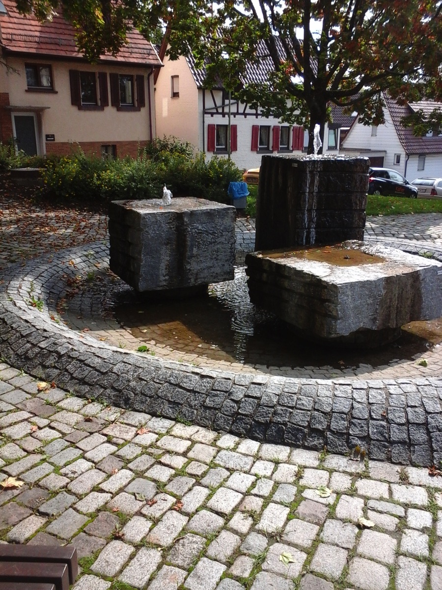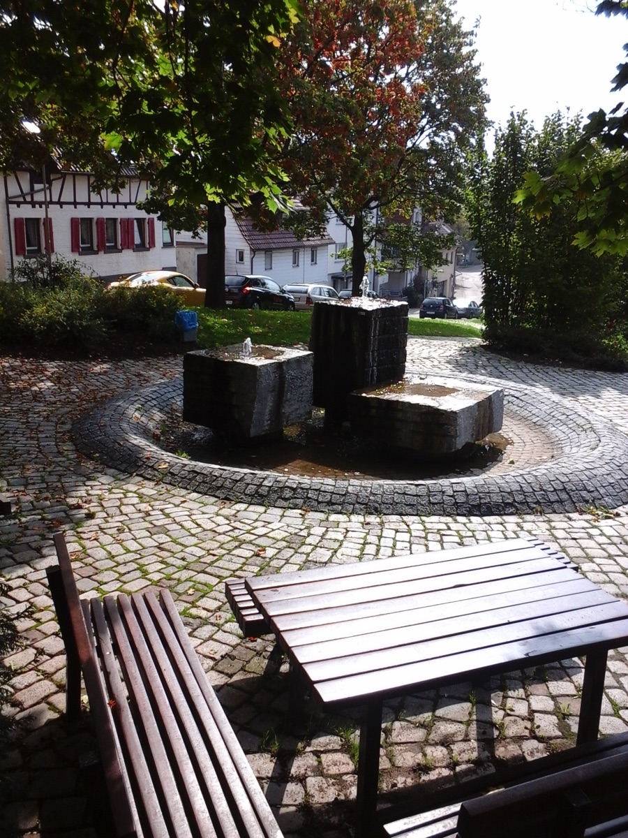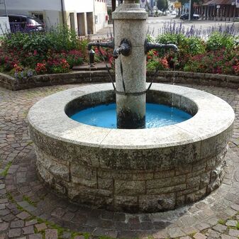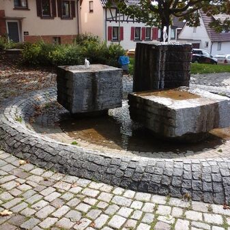 Laufbrunnen von 1979, kreisrunden Steinbecken, Brunnenstock mit vier Metallausgüssen, oben Form: Hopfen, von Gerhard Geißenhardt (Steinmetz) aus Eltingen. Sehr gut erhalten, Granit, 180cm hoch, 2mDurchmesser