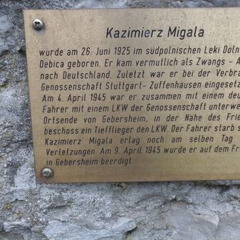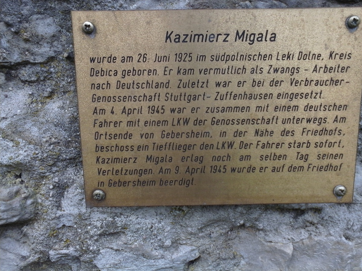 Grabstein von Kazimierz Migala“ aus Polen, der hier in der Nähe (1945 durch Tieffliegerangriff) zu Tode kam, von 1969, aus Granit mit Erläuterungstafel aus Messing, von 2010. Sehr gut erhalten, 85cm hoch, 60cm breit, 20cm tief.