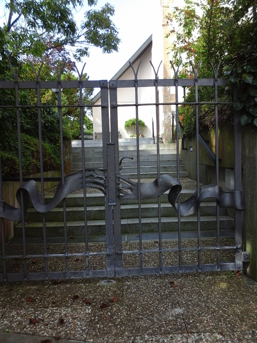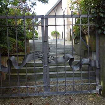 Tor aus Schmiedeeisen am Friedhof von 2008, zweiflügelig, mit „Band des Lebens“, von Gerhard Längerer (Kunstschmied) aus Renningen. Sehr gut erhalten, 180cm hoch, 230cm breit.