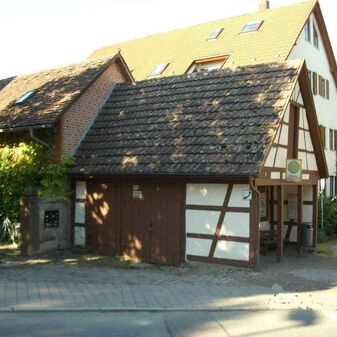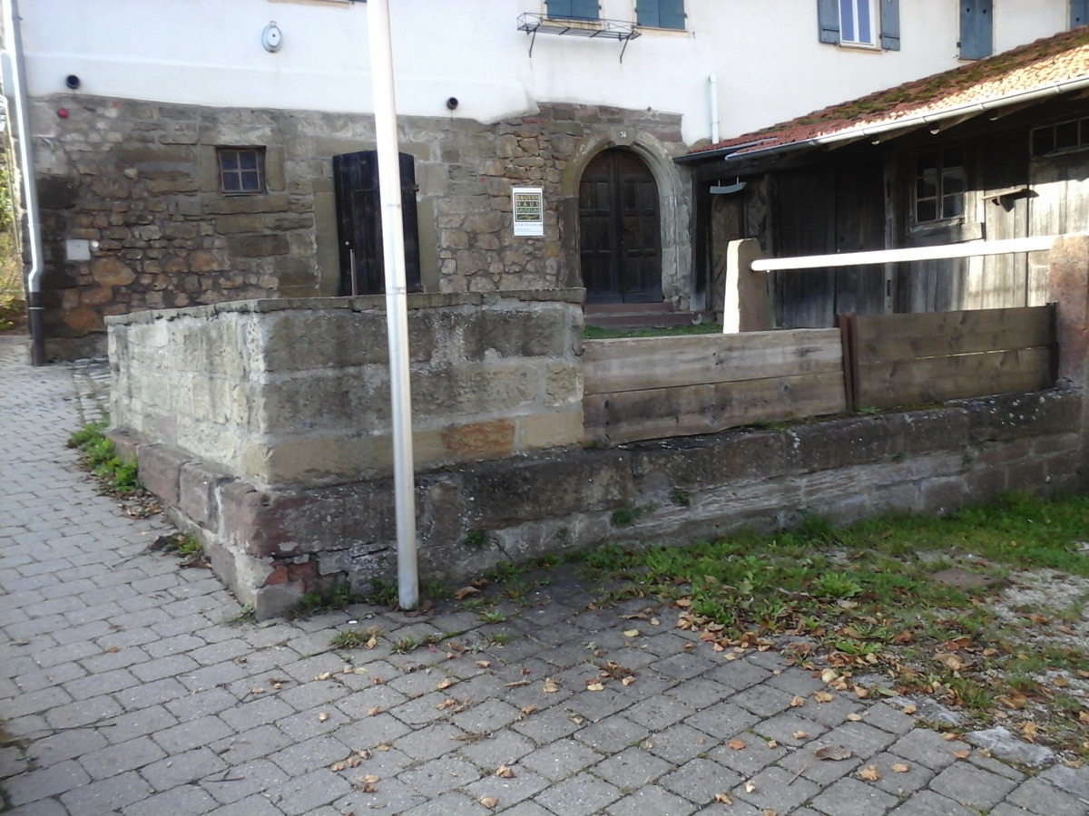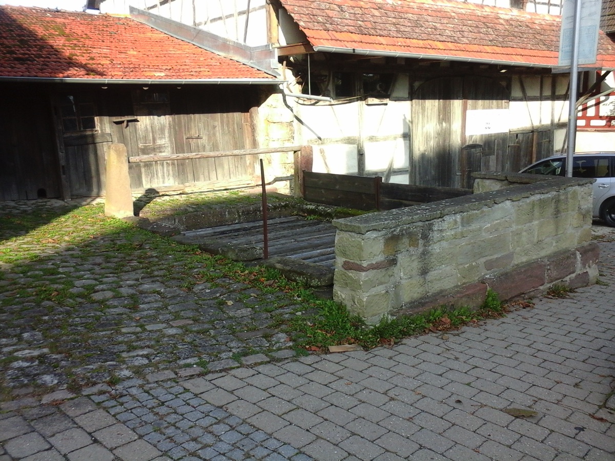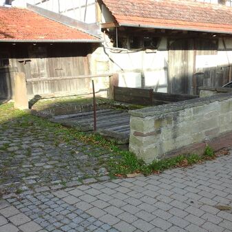 Dunglege, Miste von 1784. Gut erhalten, Sandsteinmauerwerk, Holzbretter, 80cm tief, Gebäude wurde aus Leonberg hierher transloziert, 1995 saniert.