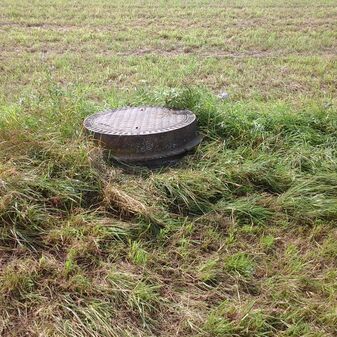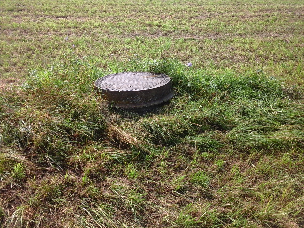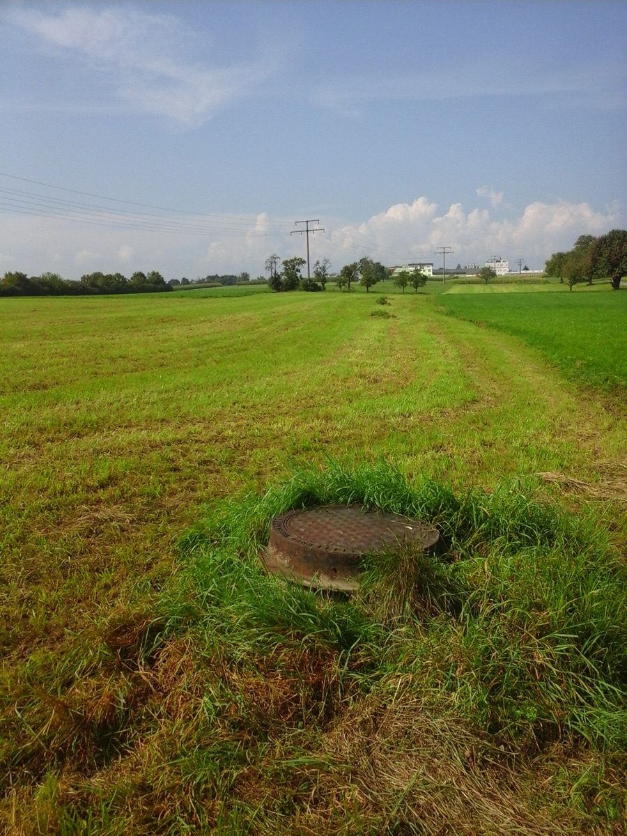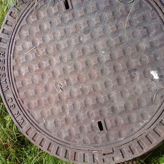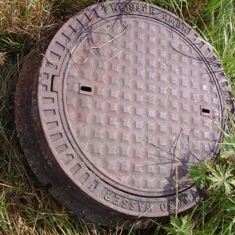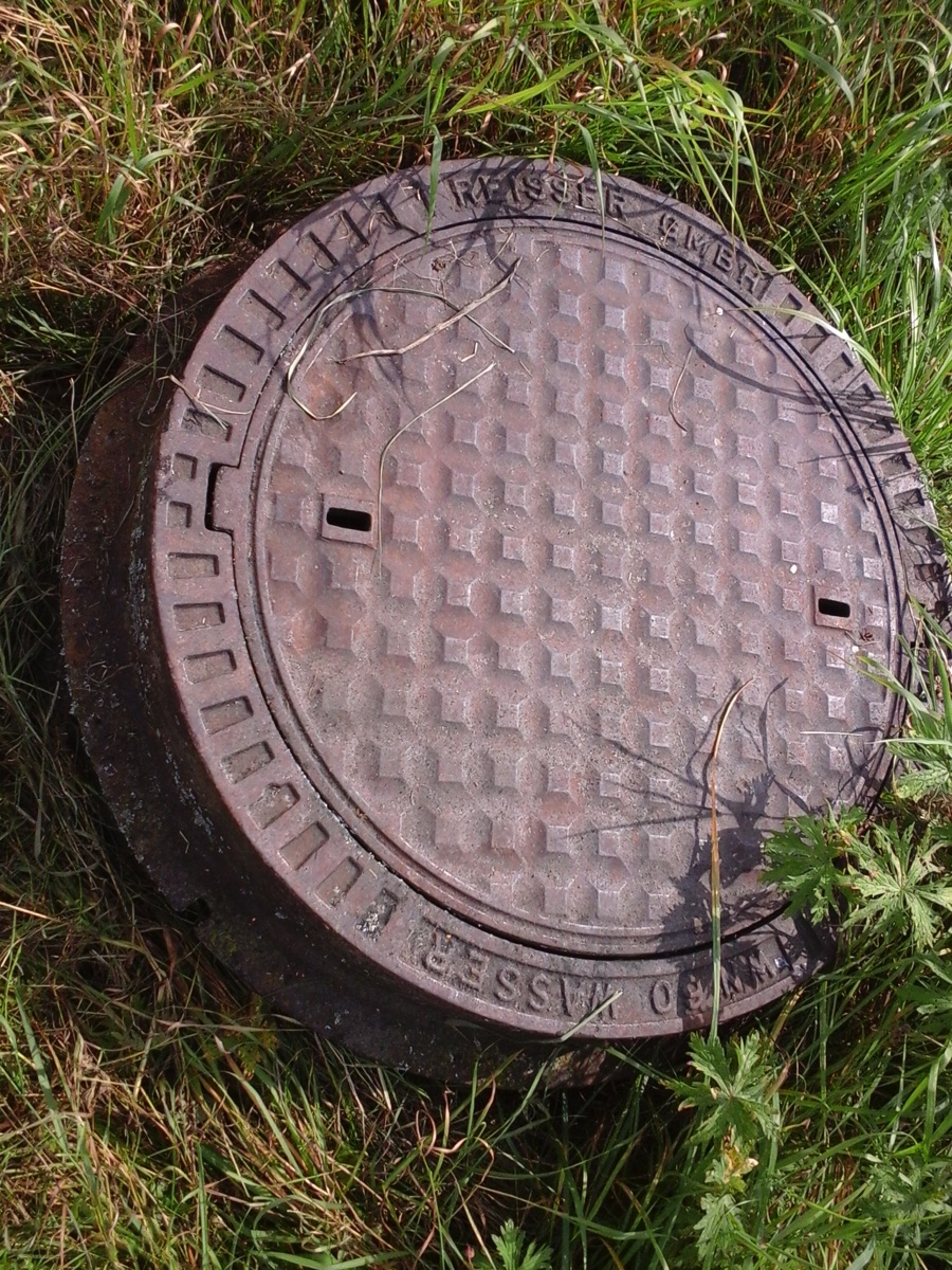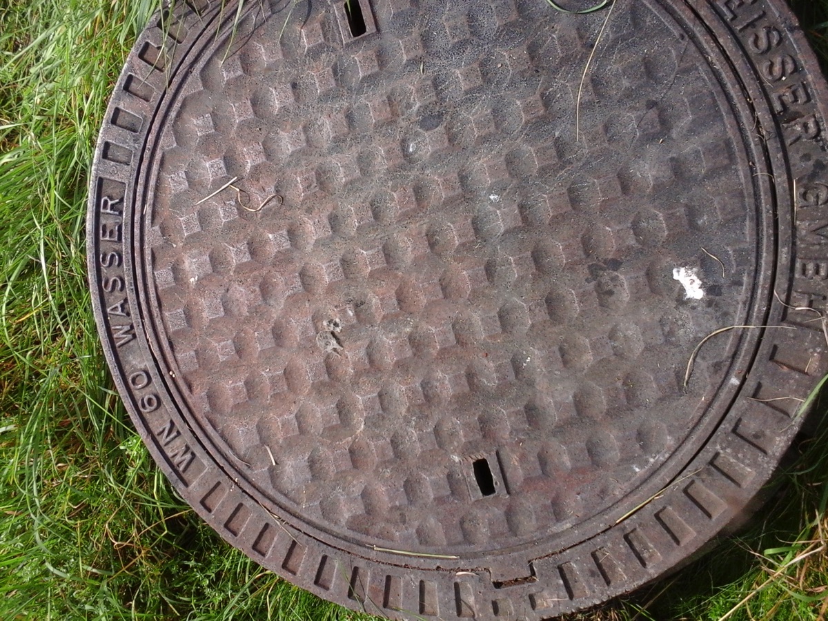 Brunnenschächte, fünf Schachtdeckel aus Gusseisen, 60cm Durchmesser, von ca. 1960, gut erhalten, mit Inschrift.
