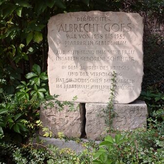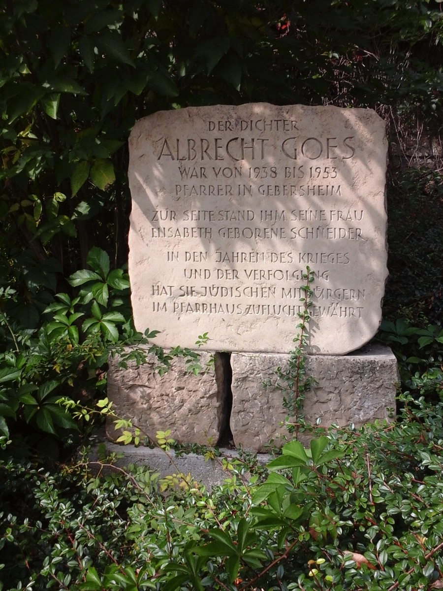 DER DICHTER / ALBRECHT GOES / WAR VON 1938 BIS 1953 / PFARRER IN GEBERSHEIM / ZUR SEITE STAND IHM SEINE FRAU / ELISABETH GEBORENE SCHNEIDER / IN DEN JAHREN DES KRIEGES / UND DER VERFOLGUNG / HAT SIE JÜDISCHE MITBÜRGERN / IM PFARRHAUS ZUFLUCHT GEWÄHRT