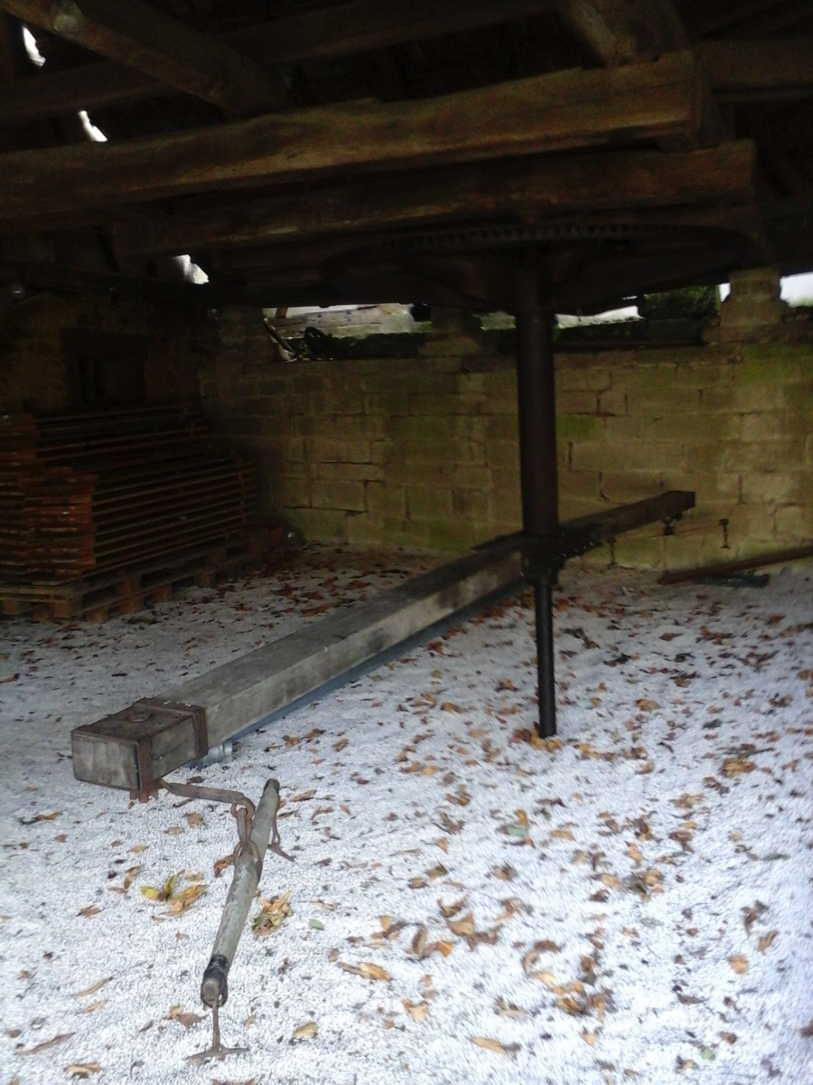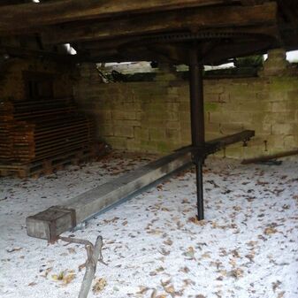 Göpelschuppen mit Göpel, offenes Holzgebäude mit Säule, Rad, Getriebe, Balken und Anspannmöglichkeit für Zugtiere, funktionsfähig, Holz, Gussstahl. Gut erhalten, 5m hoch und tief, 6m breit. 1995 ins Bauernhofmuseum transloziert.
