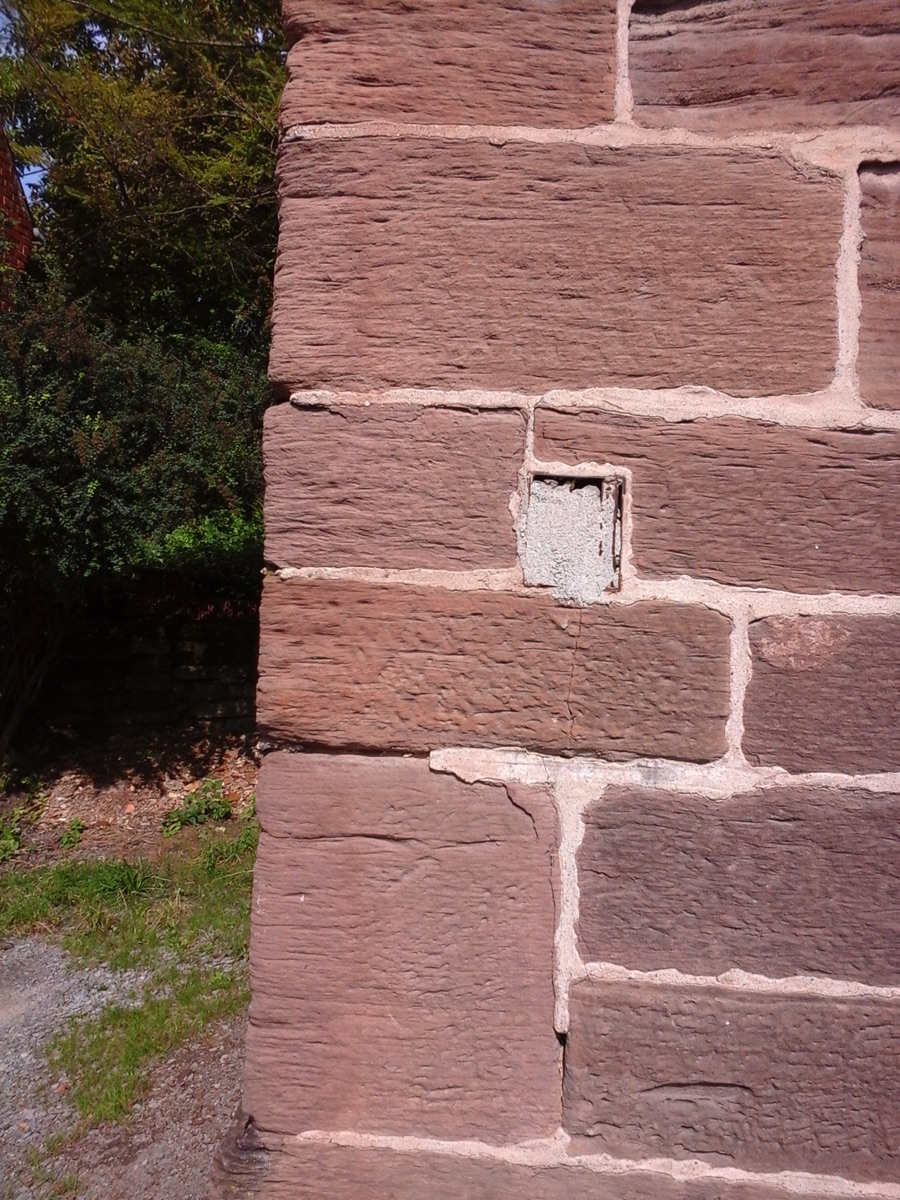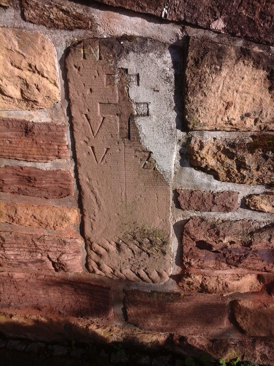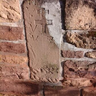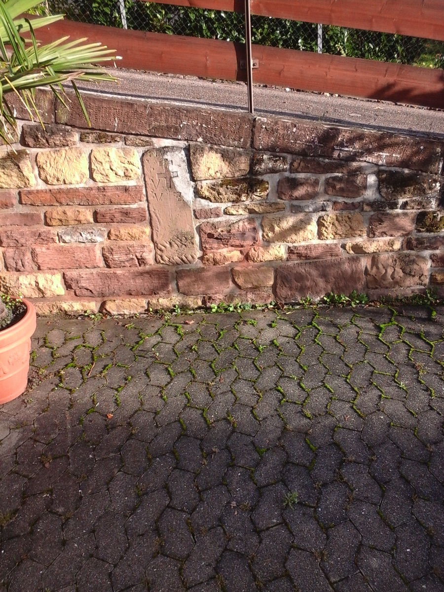 Grenzstein in Hausfassade eingemauert, rechteckige Grundform, Sandstein, gewölbter Kopf, Kennzeichnung an der Seite mit Symbol (Kreuz des Spitals von Leonberg) und Buchstaben (N, V, Z), z.T. nicht lesbar. Befriedigend erhalten, 50cm hoch, 25cm breit.