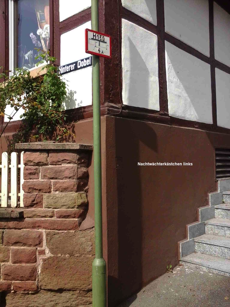 Bauteil „Nachtwächterkästchen“ aus Metall (Stahl), Befriedigend erhalten, urspr. Deckel fehlt, 10cm hoch und breit und 4cm tief, aus der Zeit vor 1930, darin befand sich ein Schlüssel für die Stechuhr des früheren Nachtwächters.
