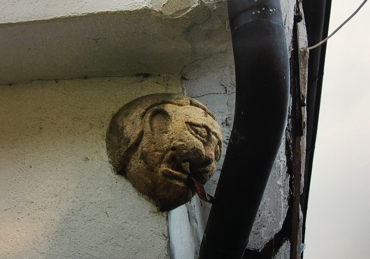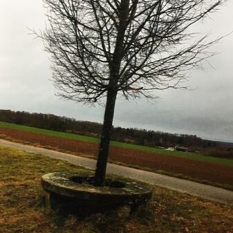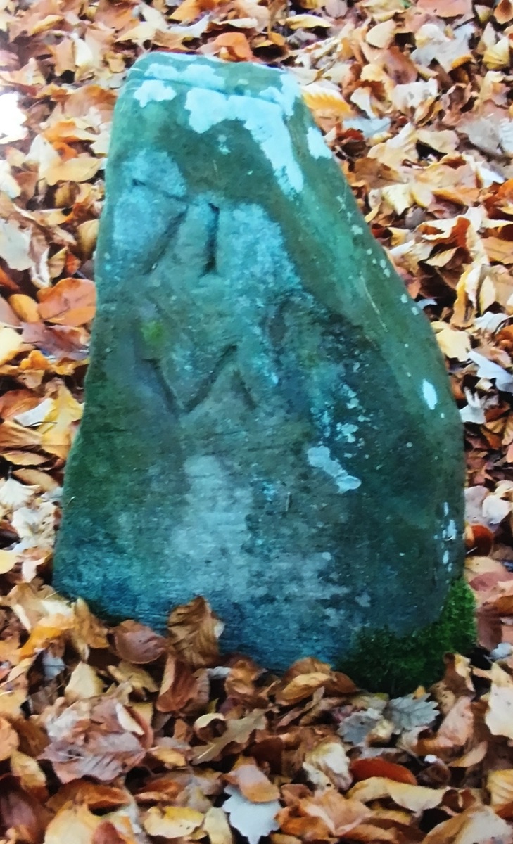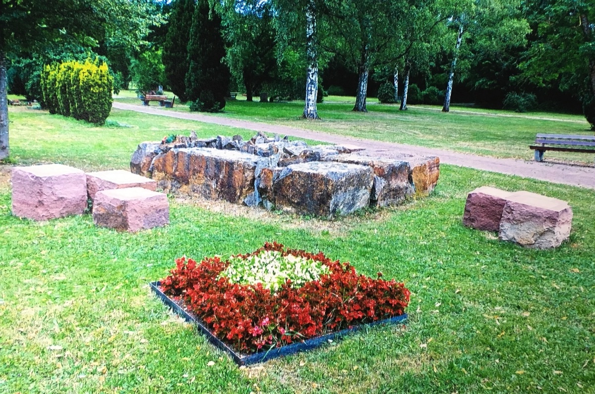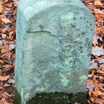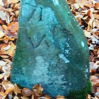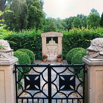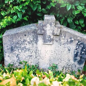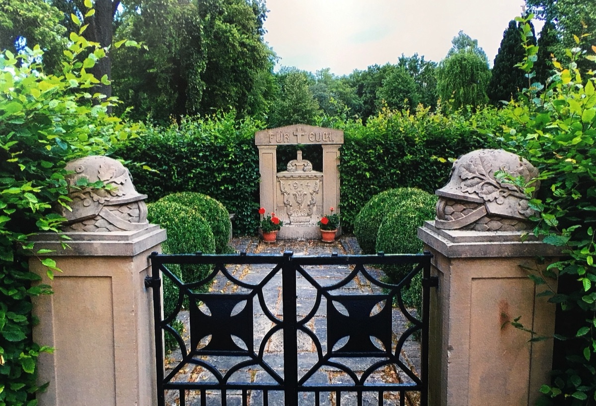 Gefallenendenkmal für sechs tote Soldaten der beiden Weltkriege, bestehend aus einem Tor aus Metall mit zwei Pfosten aus Sandstein, darauf Helme mit Eichenlaub sowie einem Gedenkstein mit Inschrift, Ornamenten, Schwert, Kreuz, zwei Pfeilern und Ranken und sechs Grabsteine mit den Namen und Lebensdaten der Verstorbenen. Gut erhalten, Gedenkstafel 1,75m hoch, 1,2m breit, 20cm tief.