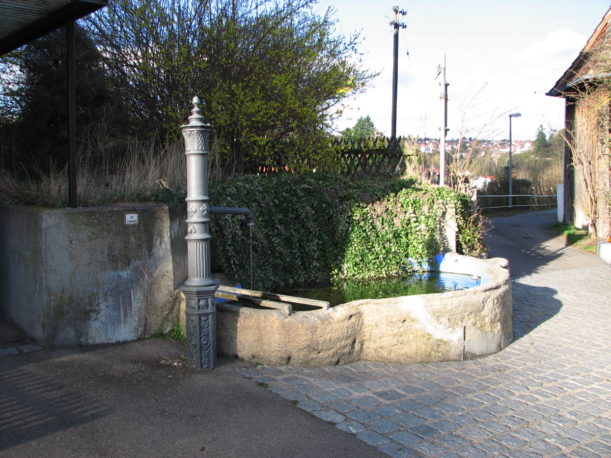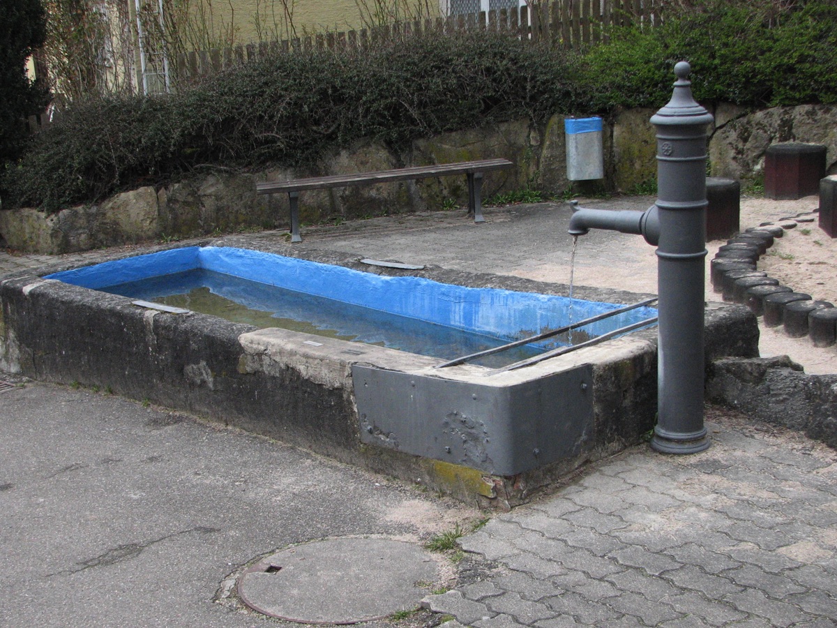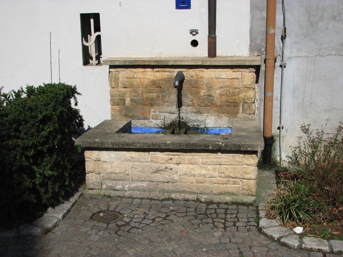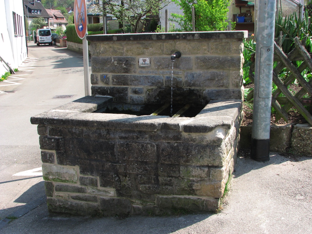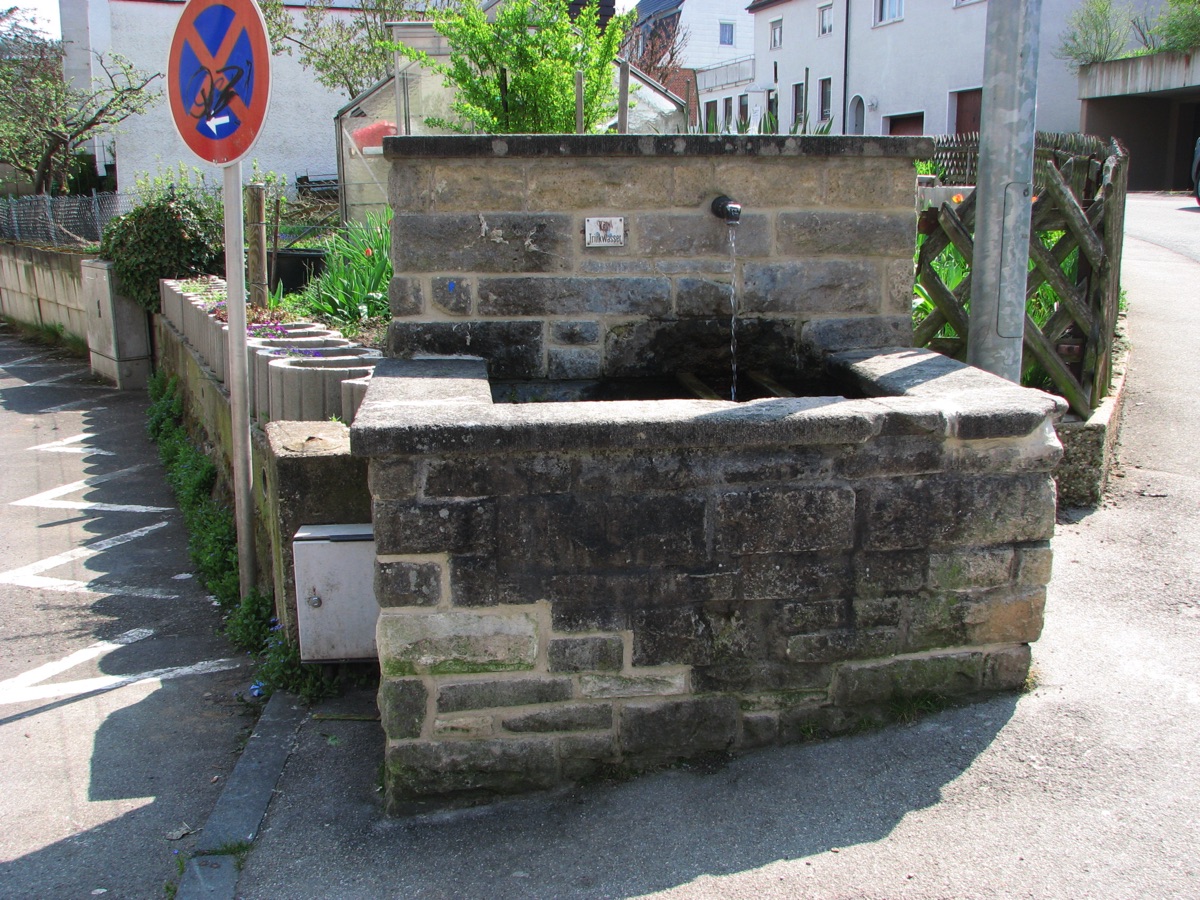 Brunnenstube für „Immenbach- oder Gaiernbrunnen“. Nur noch dreieckiges Oberteil sichtbar, der Schacht ist mit Blech abgedeckt. An der Stirnseite befindet sich ein kreisrundes Relief mit 0,26m Durchmesser. Sandstein, befriedigend erhalten. 0,50m hoch, 1,10m breit, 0,53m tief.