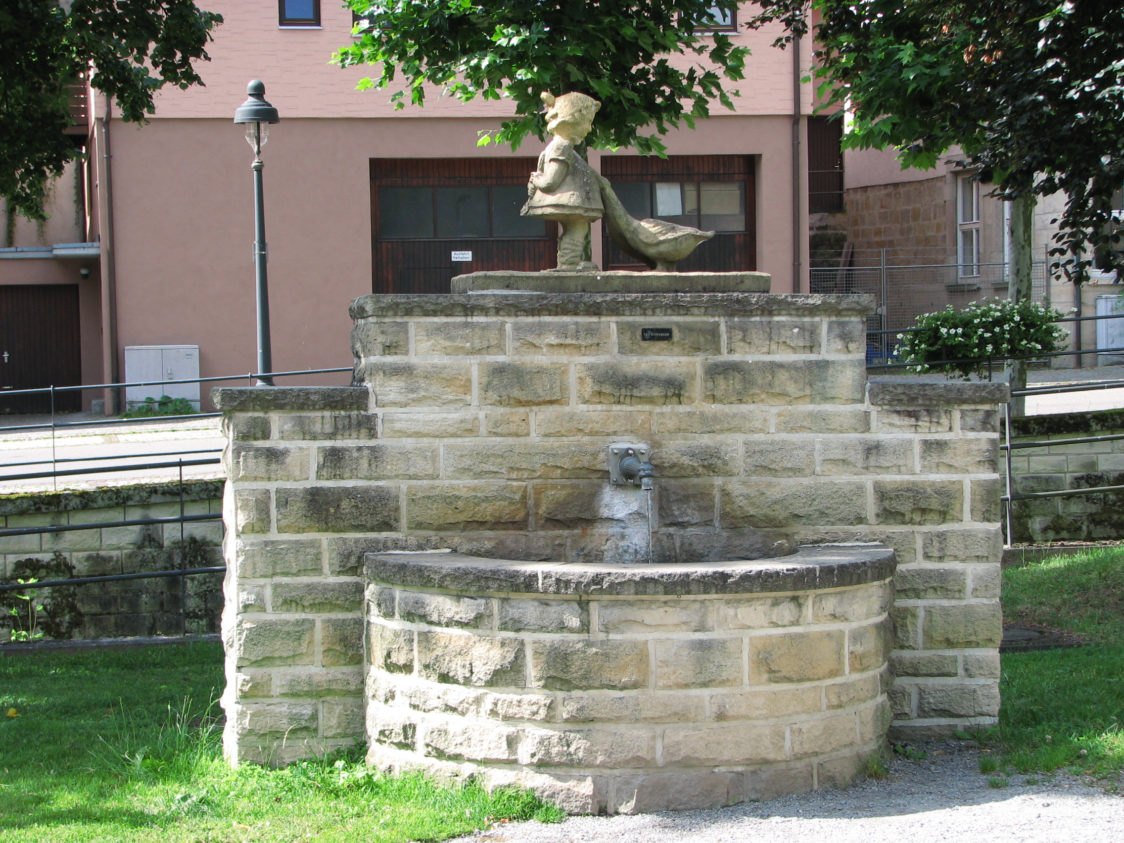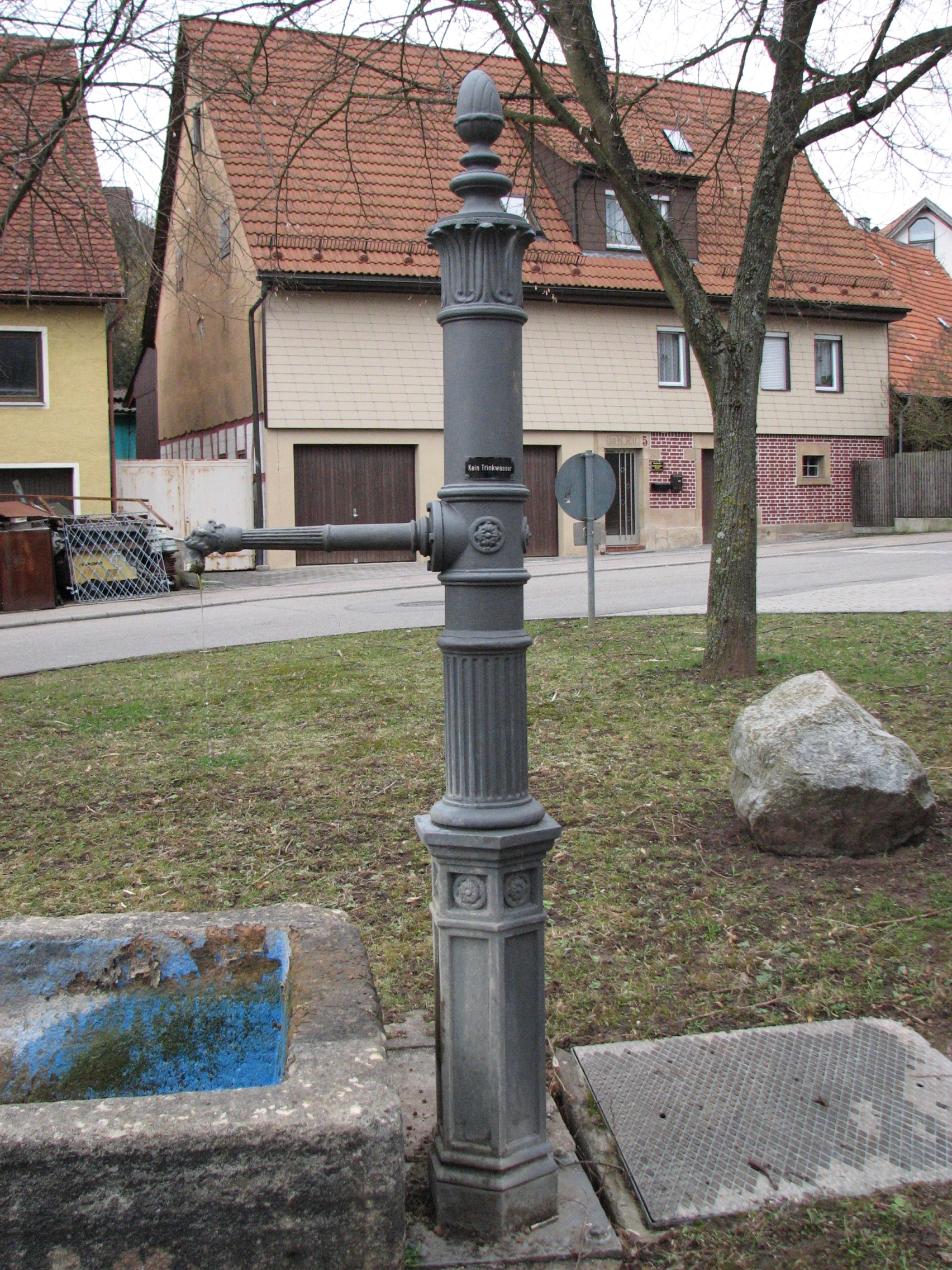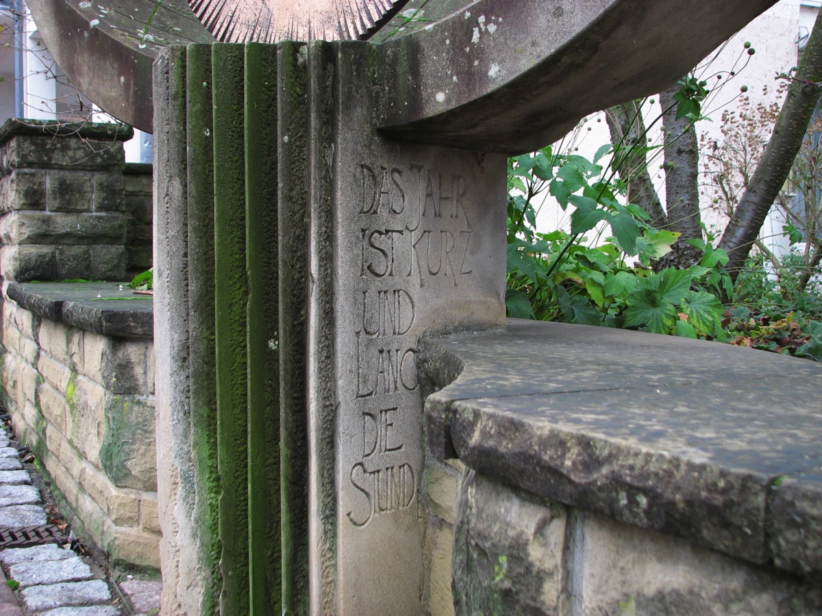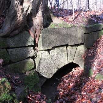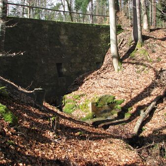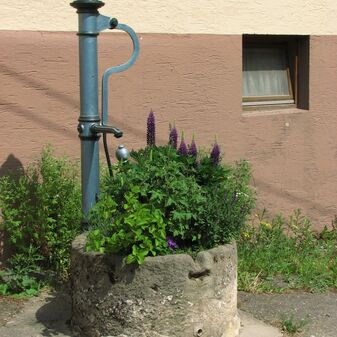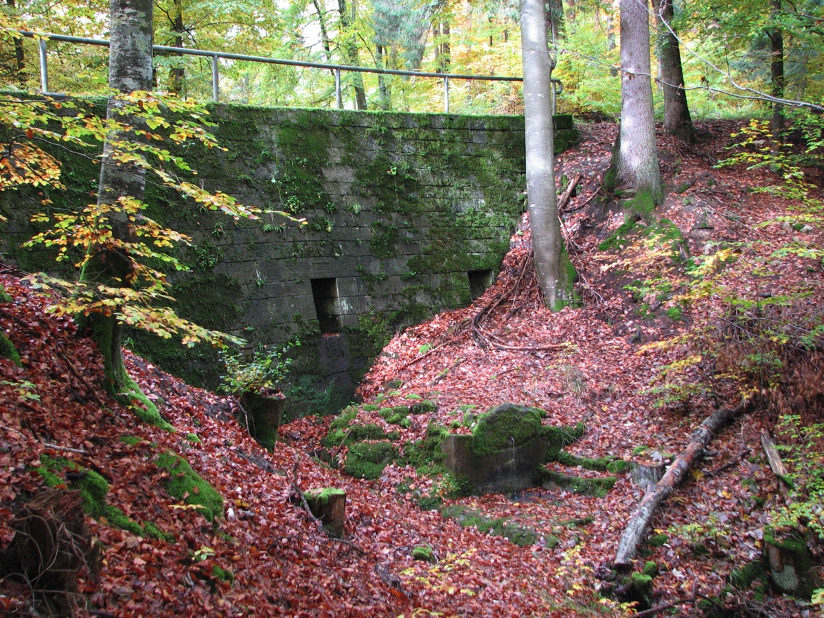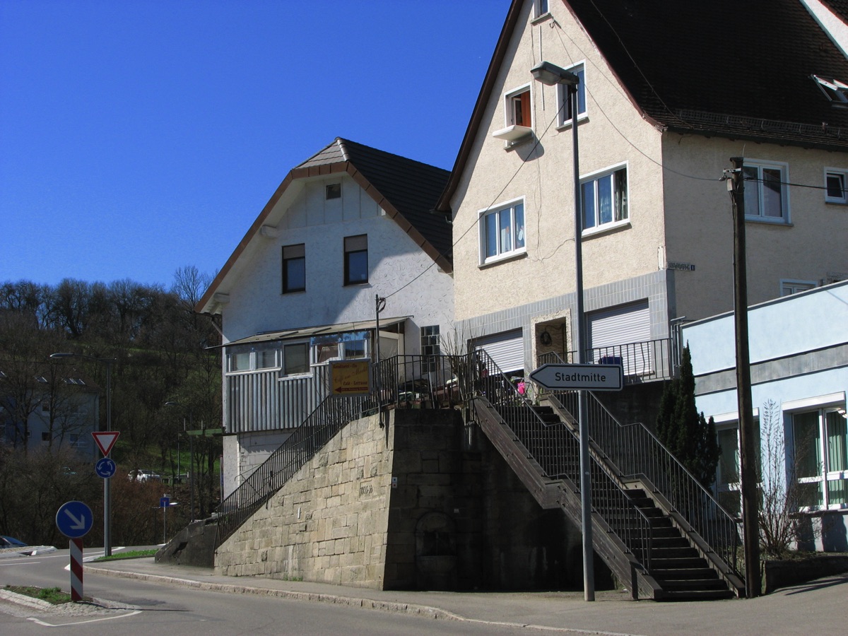 Brunnenstube für „Immenbach- oder Gaiernbrunnen“. Nur noch dreieckiges Oberteil sichtbar, der Schacht ist mit Blech abgedeckt. An der Stirnseite befindet sich ein kreisrundes Relief mit 0,26m Durchmesser. Sandstein, befriedigend erhalten. 0,50m hoch, 1,10m breit, 0,53m tief.